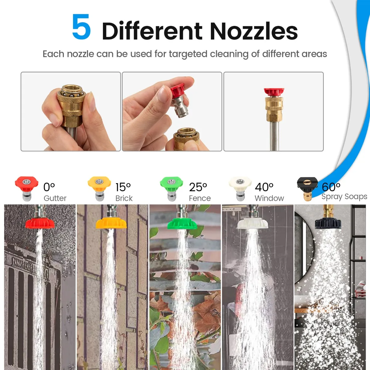 5 sproeiers met verschillende sproeihoeken (0°, 15°, 25°, 40°, 65°) om aan verschillende behoeften te voldoen