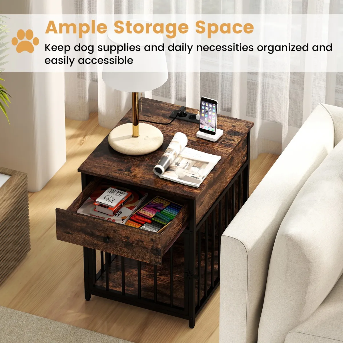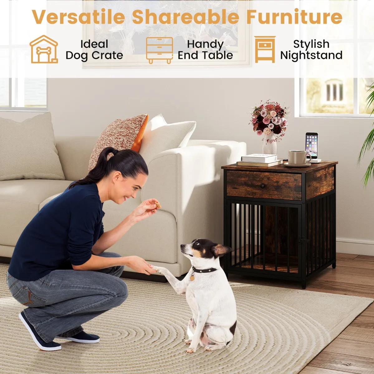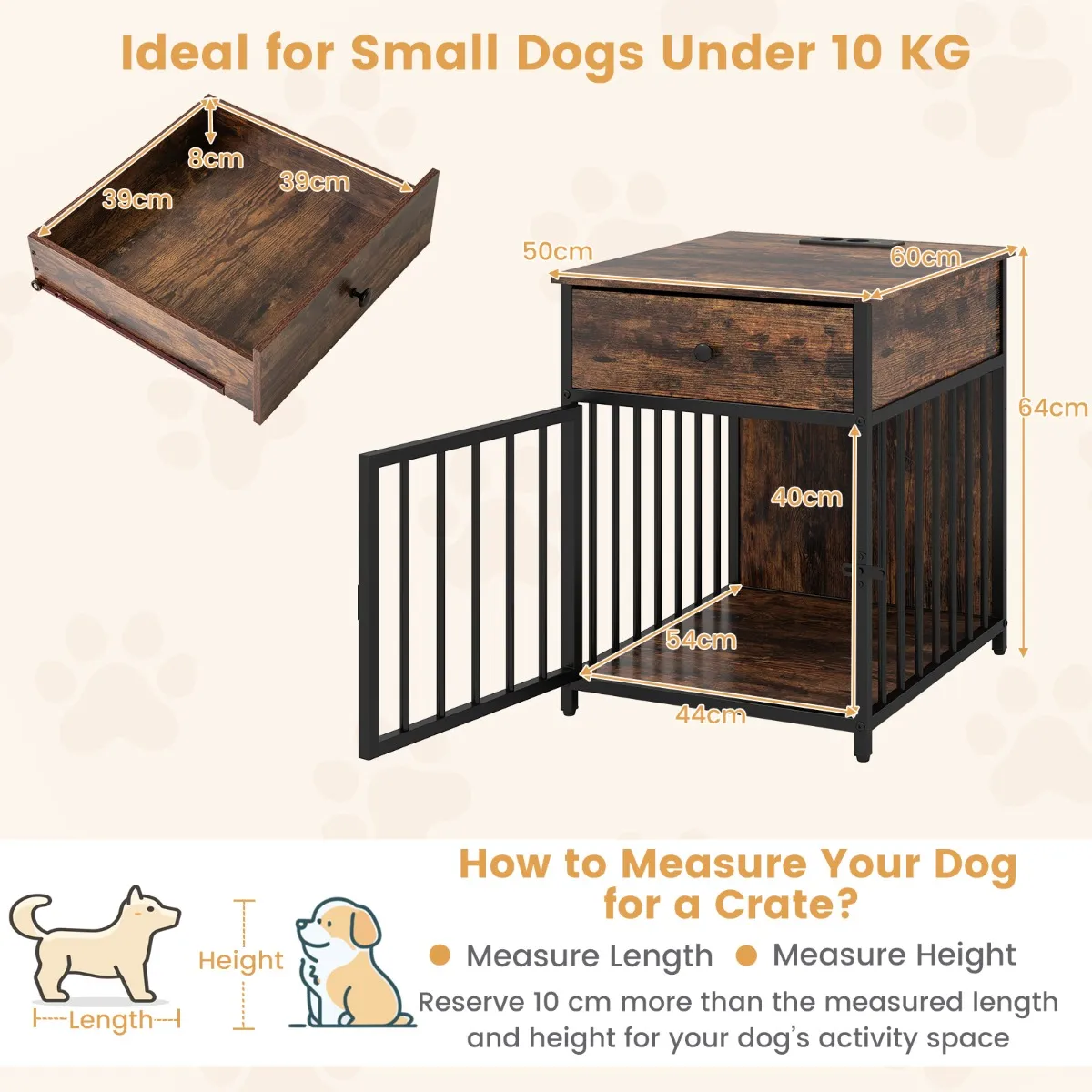 Ons hondenkratmeubel met grote lade meet 50 x 60 x 64 cm, en kan ook gebruikt worden als stijlvol bijzettafeltje of praktisch nachtkastje. Het biedt comfort voor je viervoeter, terwijl er genoeg ruimte is voor opslag en uitstalling. Bovendien is het voorzien van een oplaadstation met USB-poorten en stopcontacten, voor het gemak van het opladen van het nachtlampje en apparaten. Gemaakt van stevige metalen buizen, duurzaam en bijtbestendig, met een afsluitbare deur voor extra veiligheid. Geef je huisdier een rustig toevluchtsoord en verfraai tegelijkertijd de stijl van je huis met onze kooitafel in boerderijstijl!