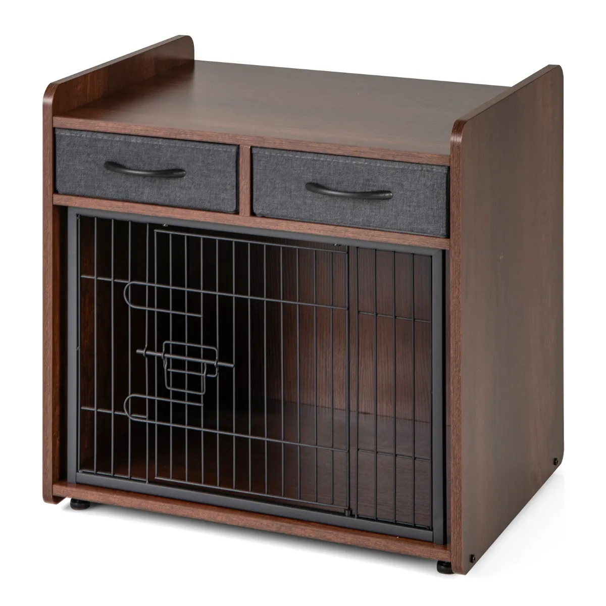 De 2-in-1 hondenkrat heeft een rustieke houtstructuur, waardoor hij in verschillende decors past. Het bovenste oppervlak en de 2 stoffen lades bieden een praktische plek voor verschillende voorwerpen. De bench is voorzien van een gaasrooster en biedt een geventileerde rustplaats waar je huisdier zich veilig en ontspannen kan voelen. De metalen deur met klink voorkomt dat hij afdwaalt. Uitgerust met verstelbare lopers, beschermt hij niet alleen je vloer, maar past hij zich ook aan oneffen oppervlakken aan. Het gemakkelijk schoon te maken oppervlak hoeft alleen maar voorzichtig afgeveegd te worden.