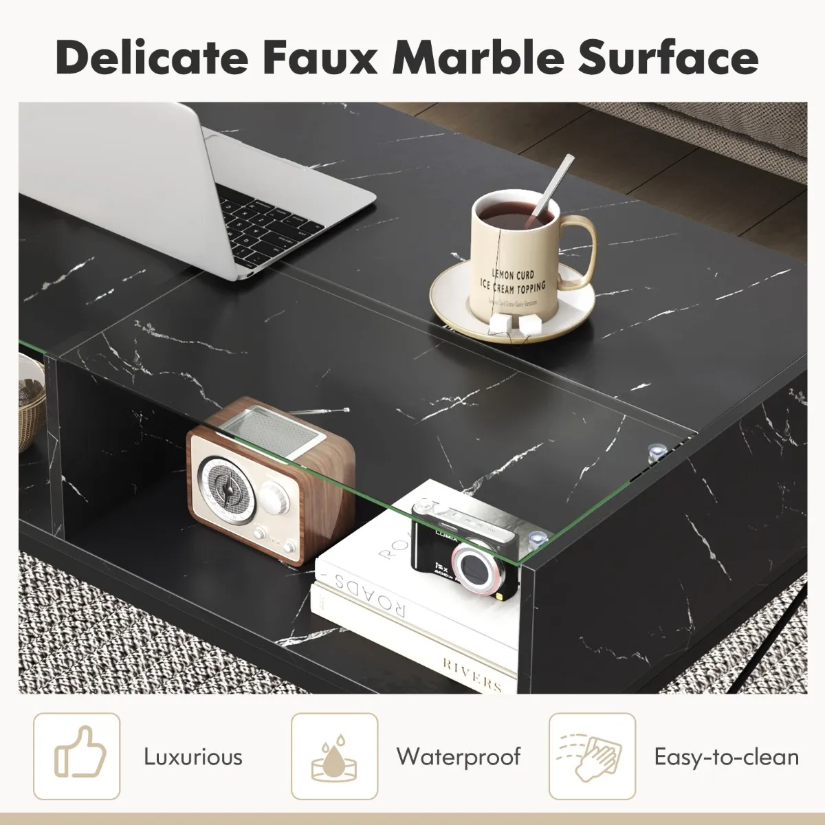 【Veelzijdig gebruik】: Door de combinatie van stijl en functionaliteit kan deze salontafel van imitatiemarmer worden gebruikt als middelpunt in woonkamers, entertainmentruimtes of zelfs als centraal punt in een hal.