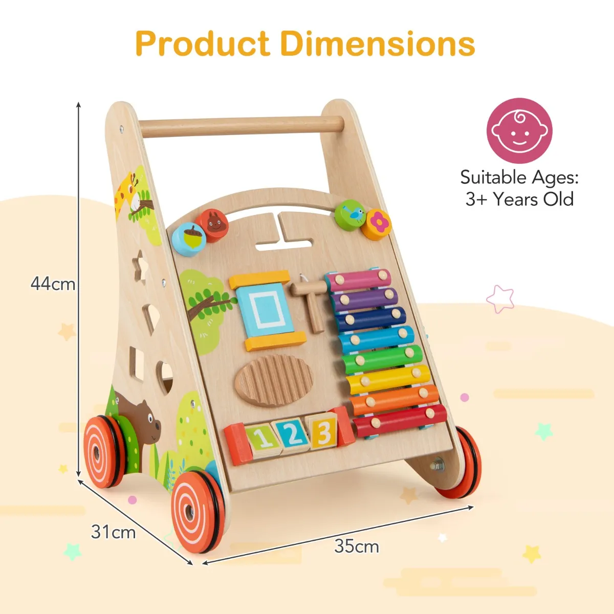 【Kindvriendelijke constructie】: Het duwende loopspeelgoed heeft een splintervrij oppervlak en afgeronde hoeken om je kind te beschermen tijdens het spelen. Bovendien houdt het opbergvak het favoriete speelgoed bij de hand voor extra gemak.