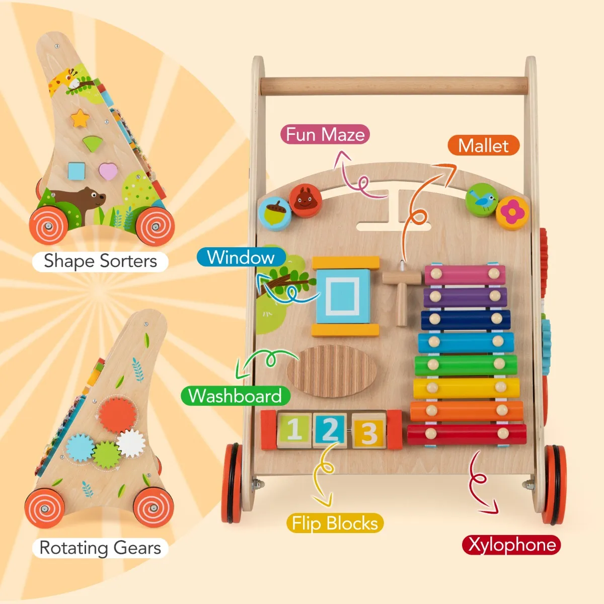 【Alles-in-één activiteitencentrum】: Dit loopstoeltje heeft een heleboel leuke activiteiten, zoals een leuk doolhof, een raam, een wasbord, schommelblokken, een hamer, een xylofoon, een vormensorteerder en draaiende tandwielen. Het is een dynamisch speelterrein om de praktische vaardigheden, het logisch denken en de kleurherkenning van je kind te stimuleren.