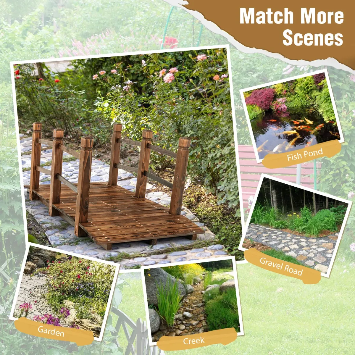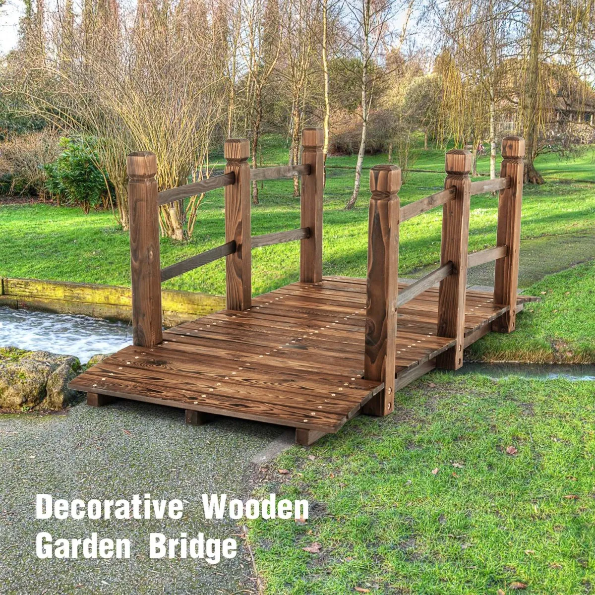 Opvallende decoratieve brug: De natuurlijke houtnerf en het klassieke design zorgen ervoor dat de brug mooi opgaat in de meeste buitenruimtes en een bijzondere charme aan je leefomgeving toevoegt. Deze houten brug over een klein beekje of tuinpad zal zeker de aandacht trekken.