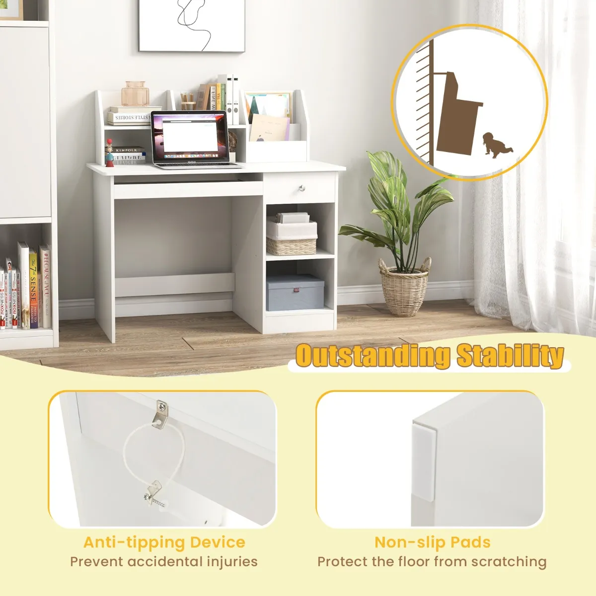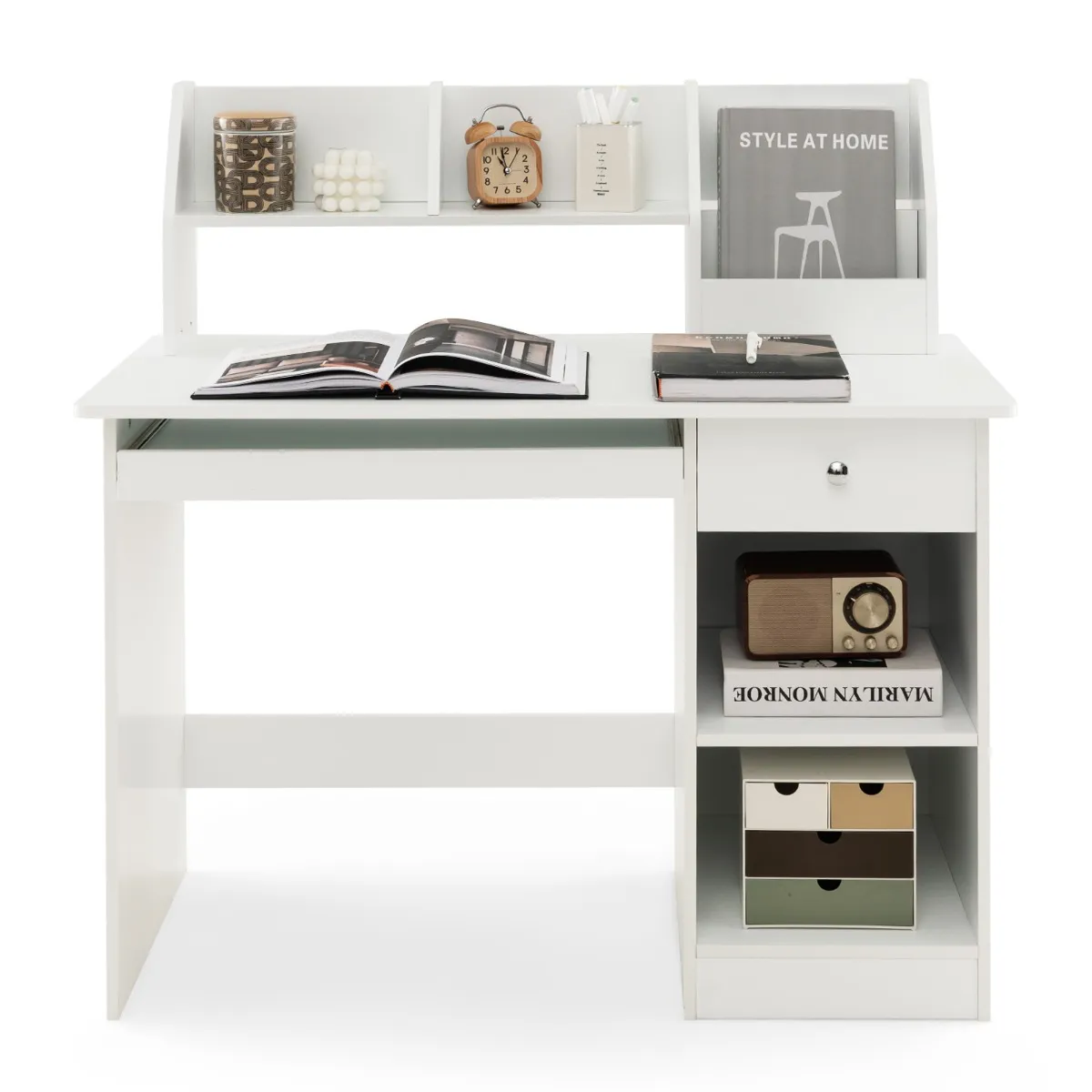Ons bureau heeft een grote tafel en toetsenbordlade, waardoor er ruimte is voor kinderen om te studeren. Er is 1 nis, 1 boekenkast, 1 lade en 2 open planken voor boeken en schrijfgerei. De toetsenbordlade en laden zijn voorzien van schuifrails, zodat ze soepel open en dicht gaan. Het onderhoudsvriendelijke oppervlak is waterdicht en duurzaam. Het wordt geleverd met een anti-kantelbeveiliging voor de veiligheid. Met strakke lijnen en een witte afwerking is het eenvoudig en modern voor verschillende inrichtingsstijlen.