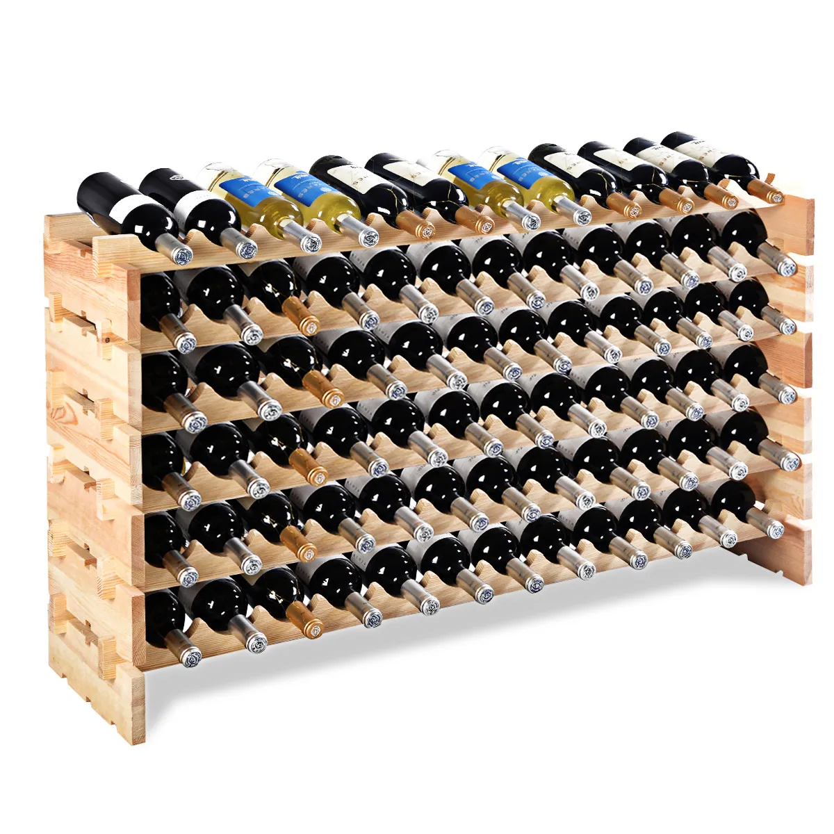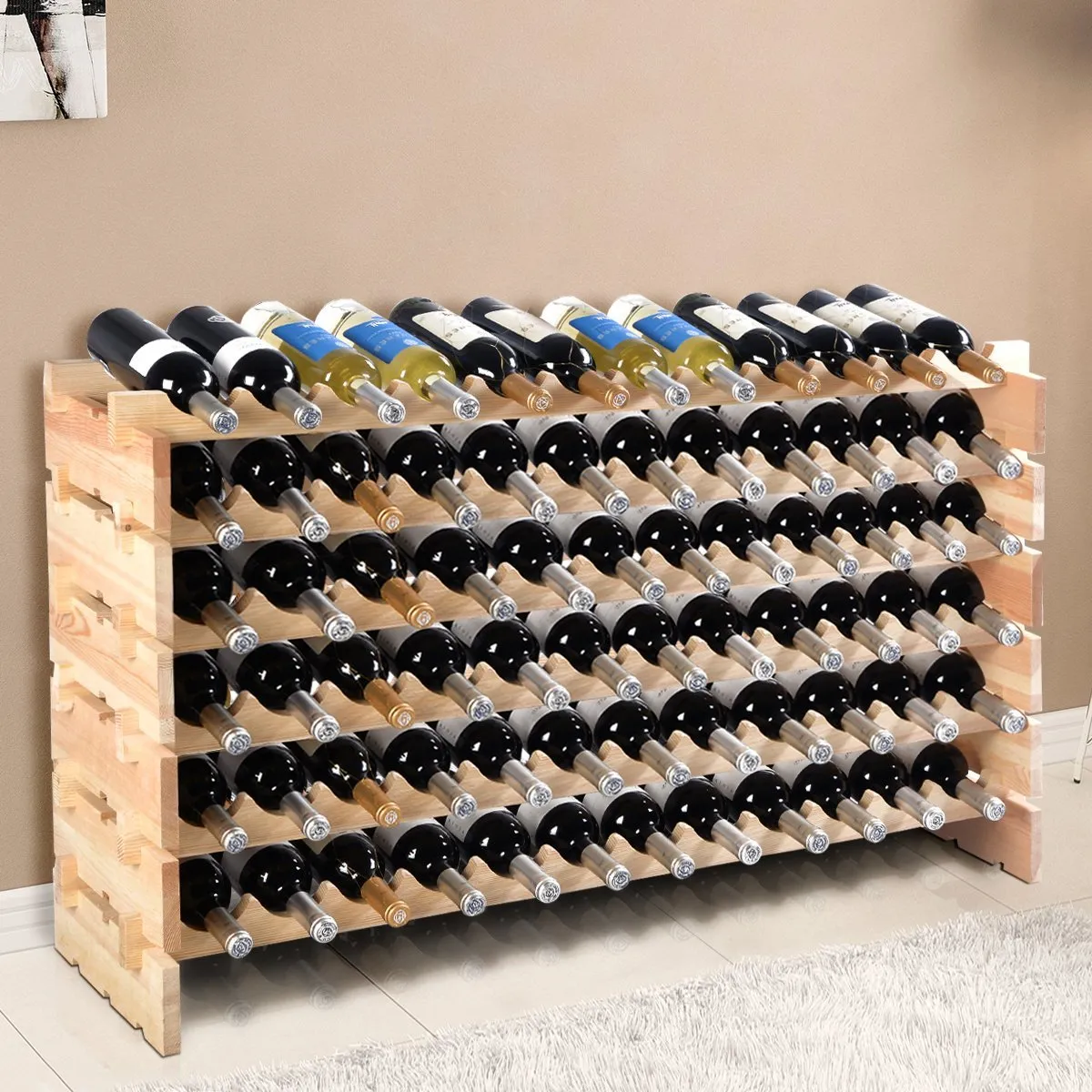 Ons wijnrek is gemaakt van hoogwaardig grenenhout en is verdikt om het duurzaam genoeg te maken voor een lange levensduur. U kunt de wijn op dit rek bewaren, wat een prestigieus gevoel aan uw huis toevoegt. Dit grote rek kan 72 flessen bevatten om aan bijna alle behoeften te voldoen. Er zijn verschillende combinaties. U kunt het zelfs verdelen in twee rekken met drie niveaus van elk.