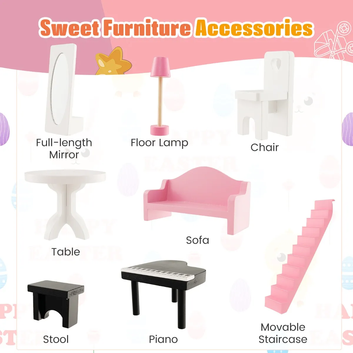 Dit houten poppenhuis van 2 verdiepingen bestaat uit 1 keuken, 1 woonkamer, 1 garderobe, 1 kaptafel, 1 studio en 1 veranda en accessoires zoals 1 spiegel, 1 staande lamp, 1 tafel, 1 stoel, 1 bank, 1 piano, 1 kruk en 1 verplaatsbare trap. Dakramen aan de zijkant, geventileerde ramen en felgekleurd behang maken het aantrekkelijk. Het grote huis is 86 cm hoog, ideaal voor kinderen vanaf 3 jaar. Met een halfopen ontwerp is de bovenste laag 42 cm hoog en de onderste laag 33 cm, waardoor kinderen plezier kunnen hebben met hun poppen.