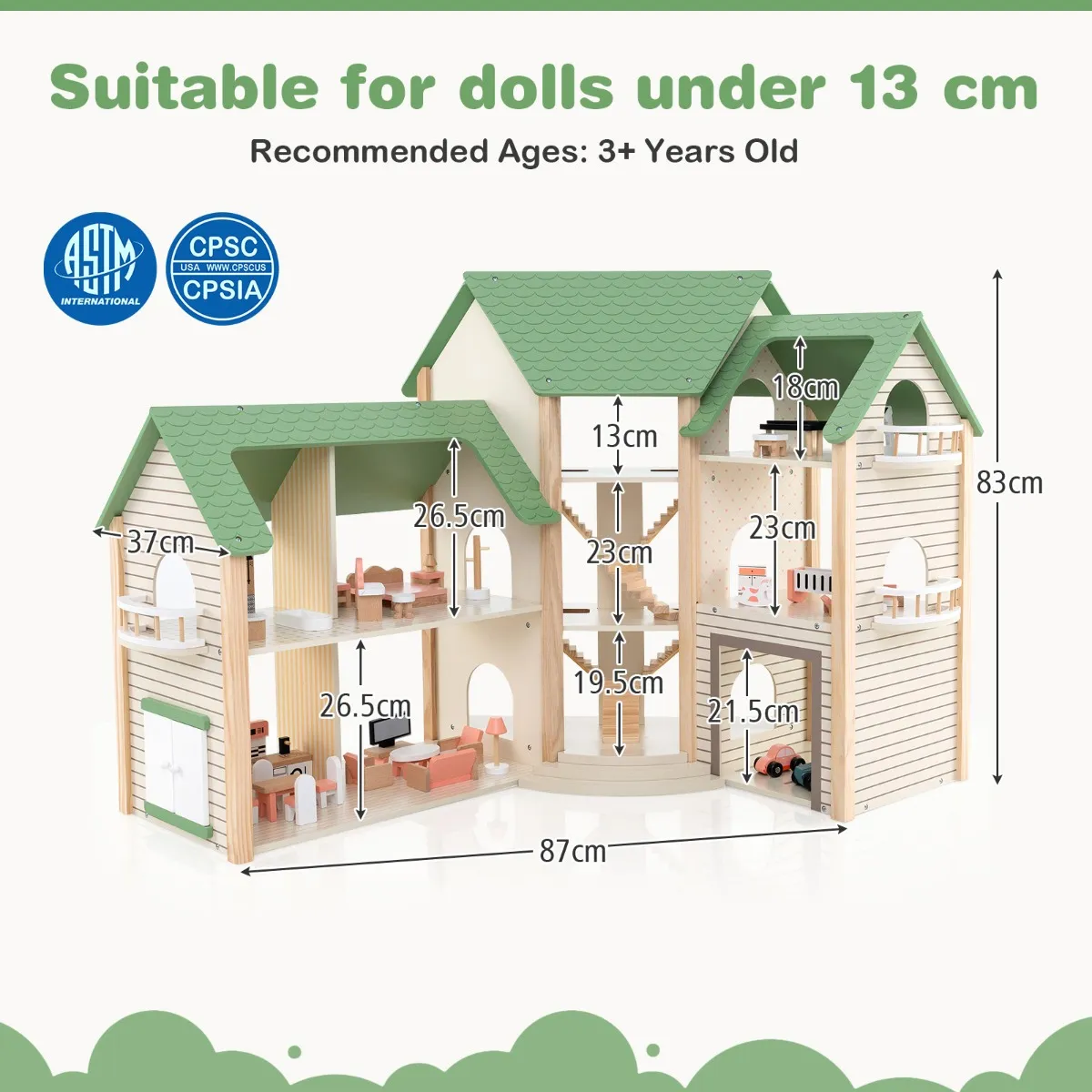 Met zijn unieke hoekontwerp past dit poppenhuis moeiteloos in elke hoek van de kamer om de speelruimte te maximaliseren. Het droomhuis heeft 3 verdiepingen, 6 kamers en 36 meubels en accessoires, biedt eindeloze ontwerpmogelijkheden en bevordert de creativiteit, fijne motoriek en organisatie van kinderen. De balkons en garage verrijken de rollenspelervaring. Kinderen kunnen ook vrienden uitnodigen voor urenlang spannend spel, waardoor hun sociale vaardigheden worden verbeterd. De kolommen en trappen van stevig grenenhout zorgen voor algehele stabiliteit. Met zijn charmante uitstraling is dit houten poppenhuis een ideaal cadeau voor kinderen vanaf 3 jaar.