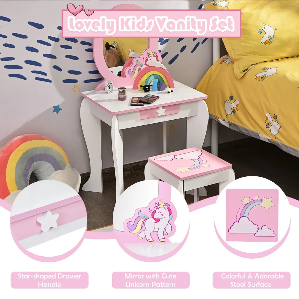 Met de duidelijke spiegel helpt dit kinderbadmeubel en krukje met schattige patronen je meisje de droom van een prinses te verwezenlijken, want ze kan hier haar make-up doen en zich aankleden. U kunt de spiegel verwijderen wanneer uw kinderen zich moeten concentreren op tekenen of schrijven. Na het opmaken of leren is er een praktische lade met veel ruimte om spullen op te bergen en het tafelblad schoon en netjes te houden. Met het oog op de veiligheid van uw kinderen is deze hoogwaardige ijdelheidsset voorzien van afgeronde randen en een anti-kantelbeveiliging. Met de instructies is de montage snel gebeurd. Het gladde oppervlak is gemakkelijk schoon te maken met een vochtige doek.