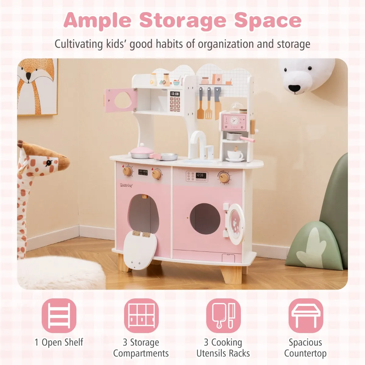 【Ruime opbergruimte】: Deze keukenset is voorzien van meerdere opbergruimtes, zodat al uw accessoires overzichtelijk opgeborgen kunnen worden. Door dit functionele ontwerp leren kinderen ook hoe belangrijk netheid is en hoe ze goede gewoonten ontwikkelen op het gebied van organiseren en opruimen.