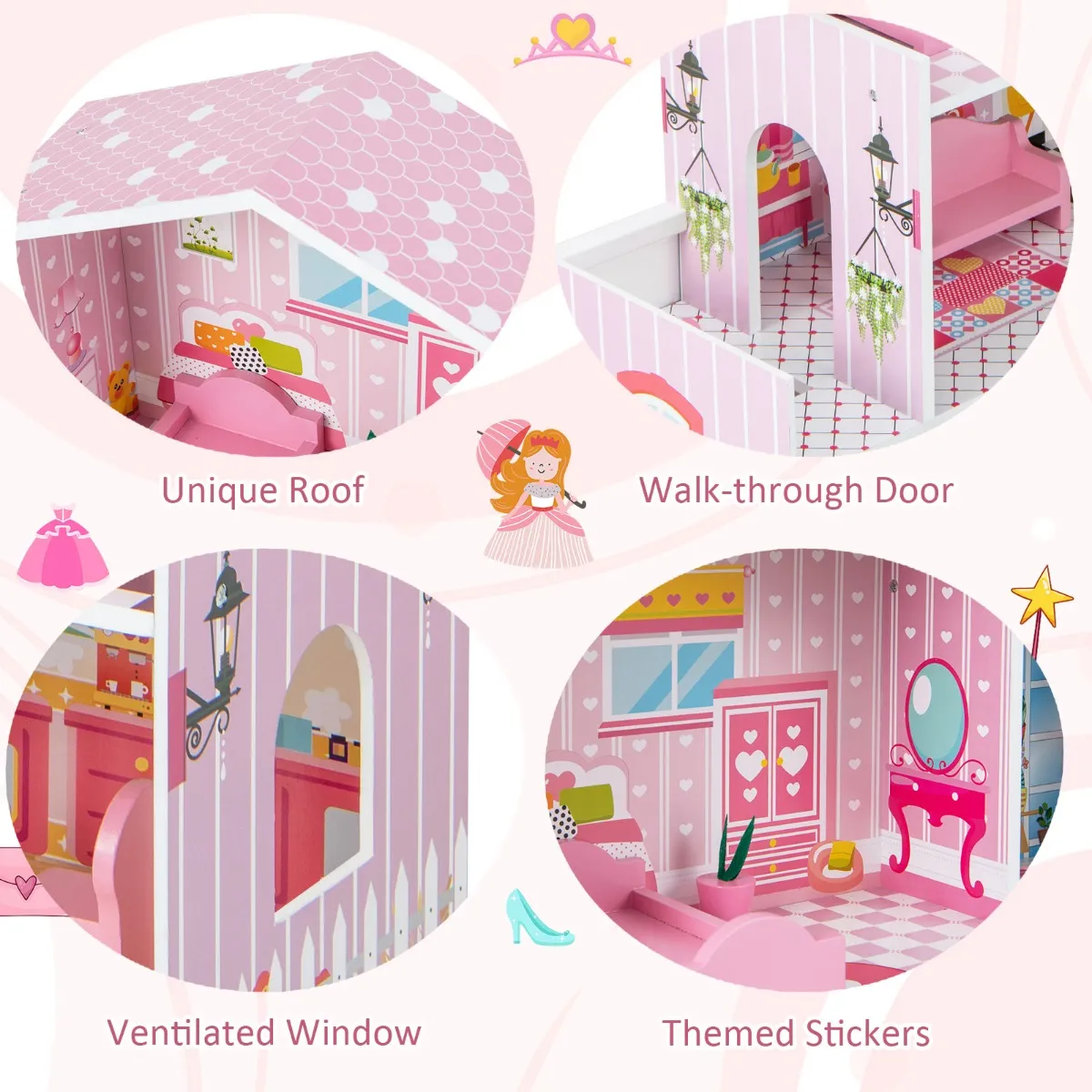 【Themastickers en decoraties】Elke kamer is uitgerust met bijpassend behang, vloertegels en andere decoraties. Kinderen kunnen dus urenlang spelen met dit poppenhuis van 3 verdiepingen. Bovendien zorgen de voordeur en het geventileerde raam voor een realistischere ervaring.