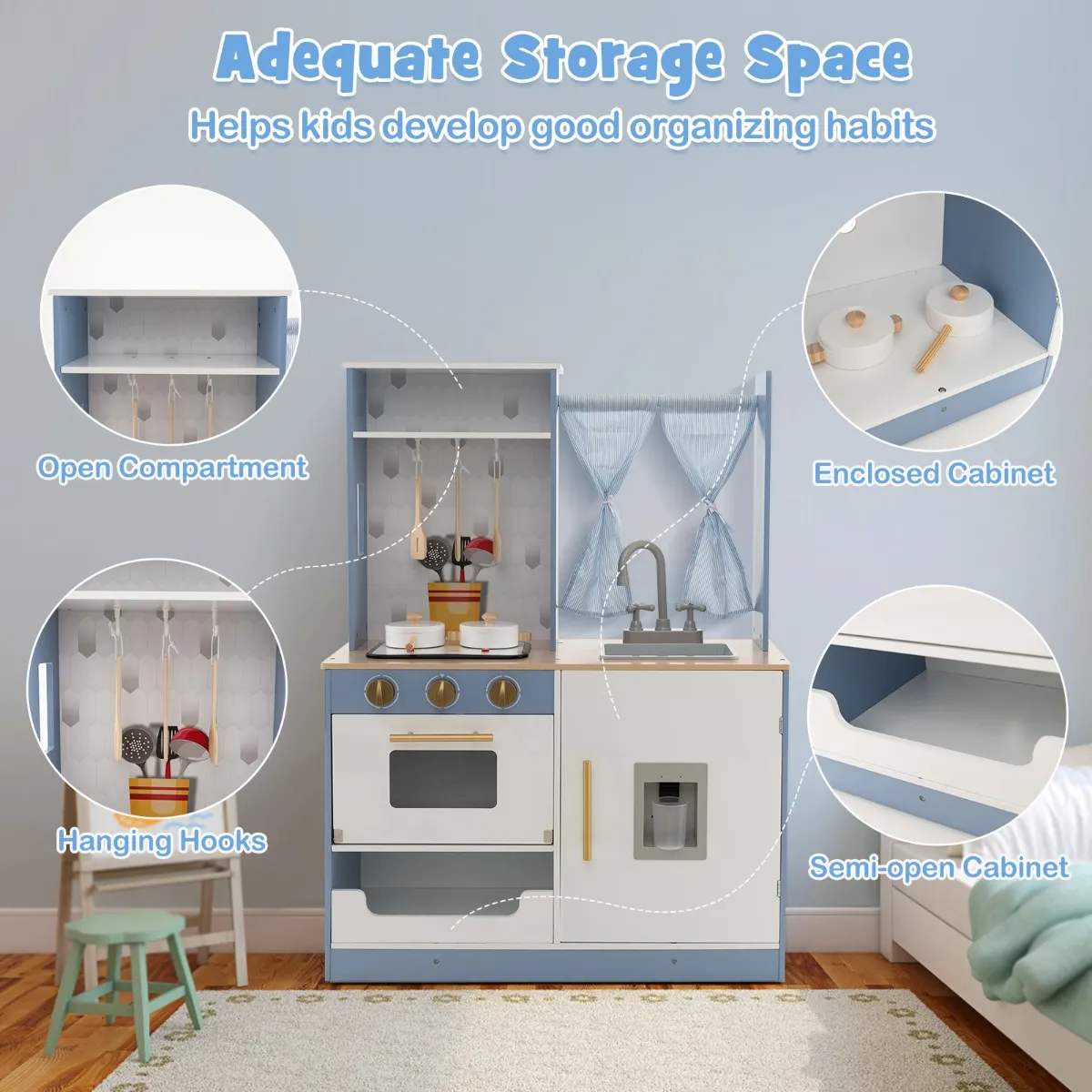 Voldoende opbergruimte: De kinderkeuken heeft voldoende opbergruimte, waardoor ze goede organisatiegewoonten kunnen ontwikkelen. Na het spelen kunnen de gebruiksvoorwerpen aan haken worden gehangen. Op dezelfde manier kan ander keukengerei in het open vak of in de halfopen kast worden geplaatst, zodat u er gemakkelijk bij kunt. Terwijl de gesloten kast voorwerpen beschermt tegen stof.