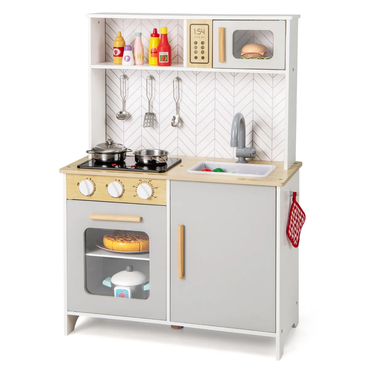 Deze houten keukenset bevat fornuizen met licht en geluid, een magnetron, een oven, een kraan, een gootsteen en draaiknoppen die klikken voor urenlang fantasierijk speelplezier. Het is uitgerust met een anti-kantelset voor een stabiele en veilige installatie. Dankzij de ruime opbergruimte kunnen de meegeleverde accessoires en andere spullen erin worden opgeborgen. Zo leren kinderen hoe ze moeten organiseren. Het is een perfect cadeau voor kinderen vanaf 3 jaar. Het stimuleert hun creativiteit, praktische vaardigheden en sociale vaardigheden.