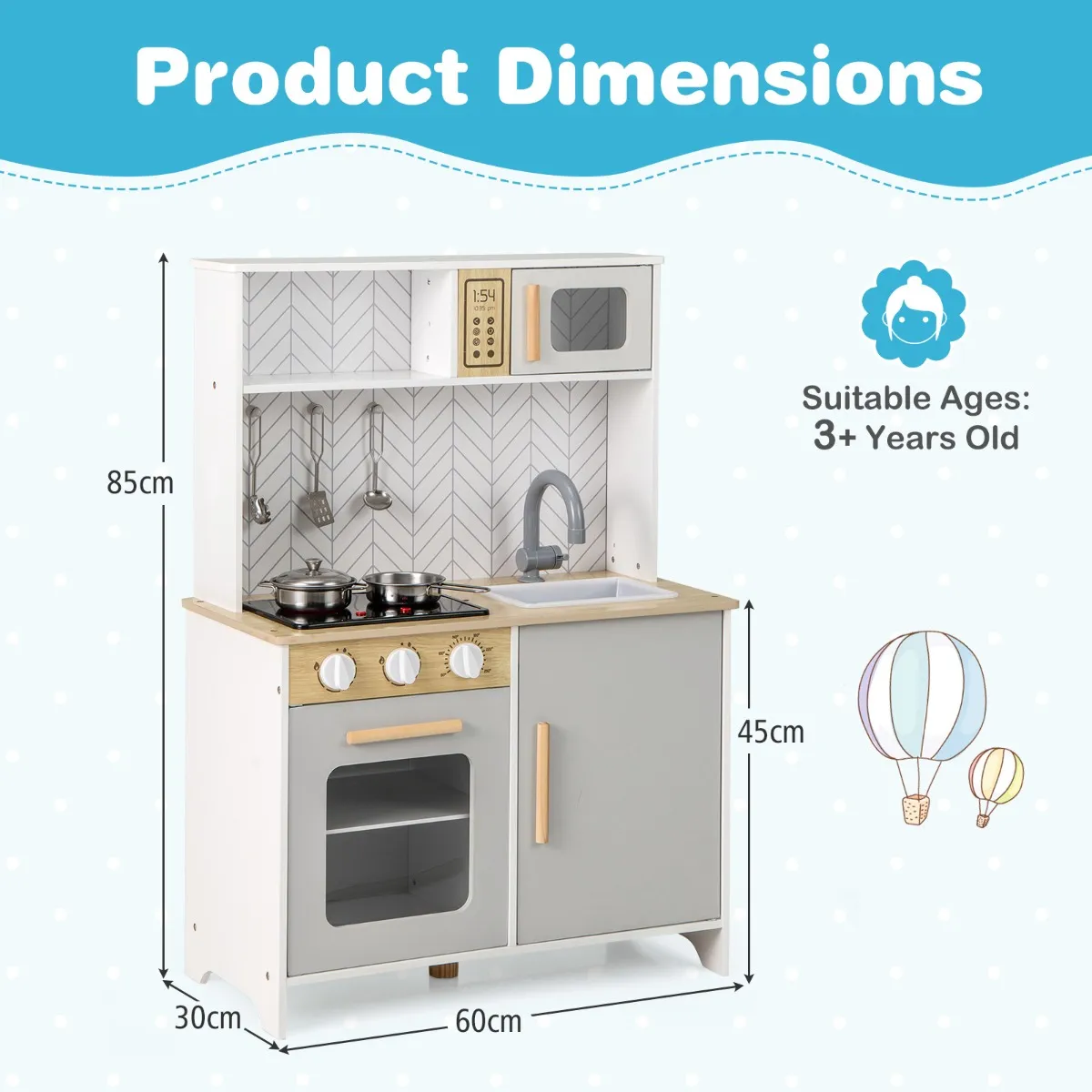 【Ontworpen voor veiligheid en stabiliteit】: Deze speelkeuken is uitgerust met een anti-kantelvoorziening en kan voor extra veiligheid aan de muur worden bevestigd. Bovendien wordt de keuken ondersteund door stevige grenenhouten poten, zodat uw kind veilig kan spelen.