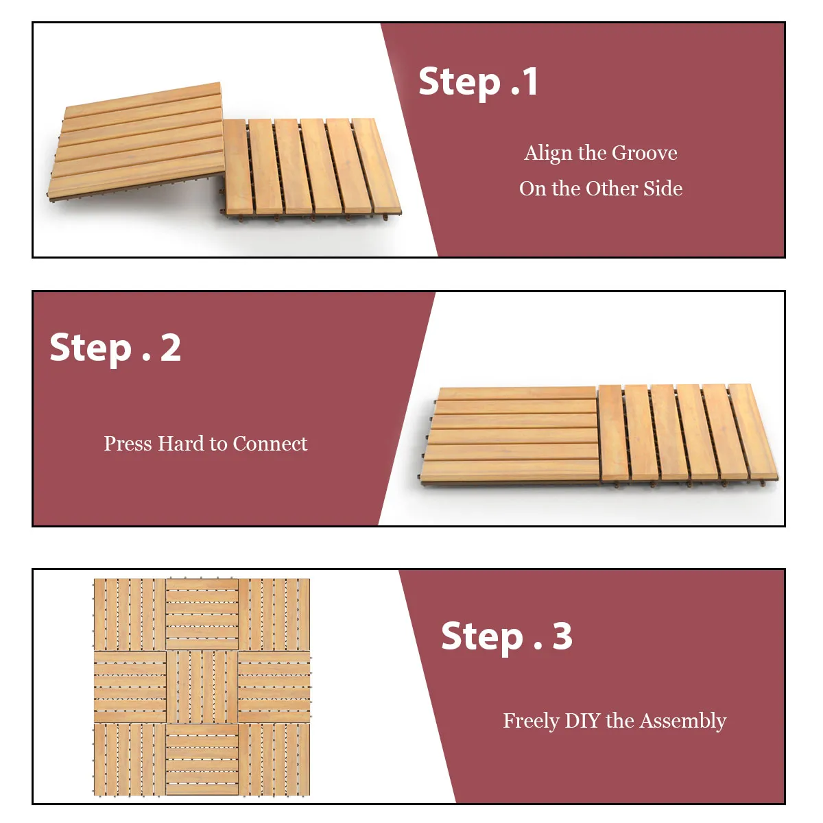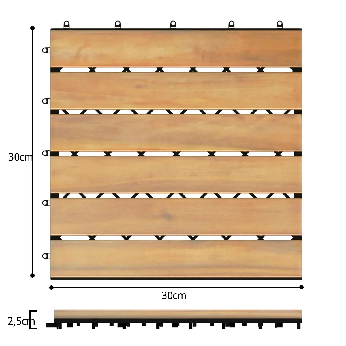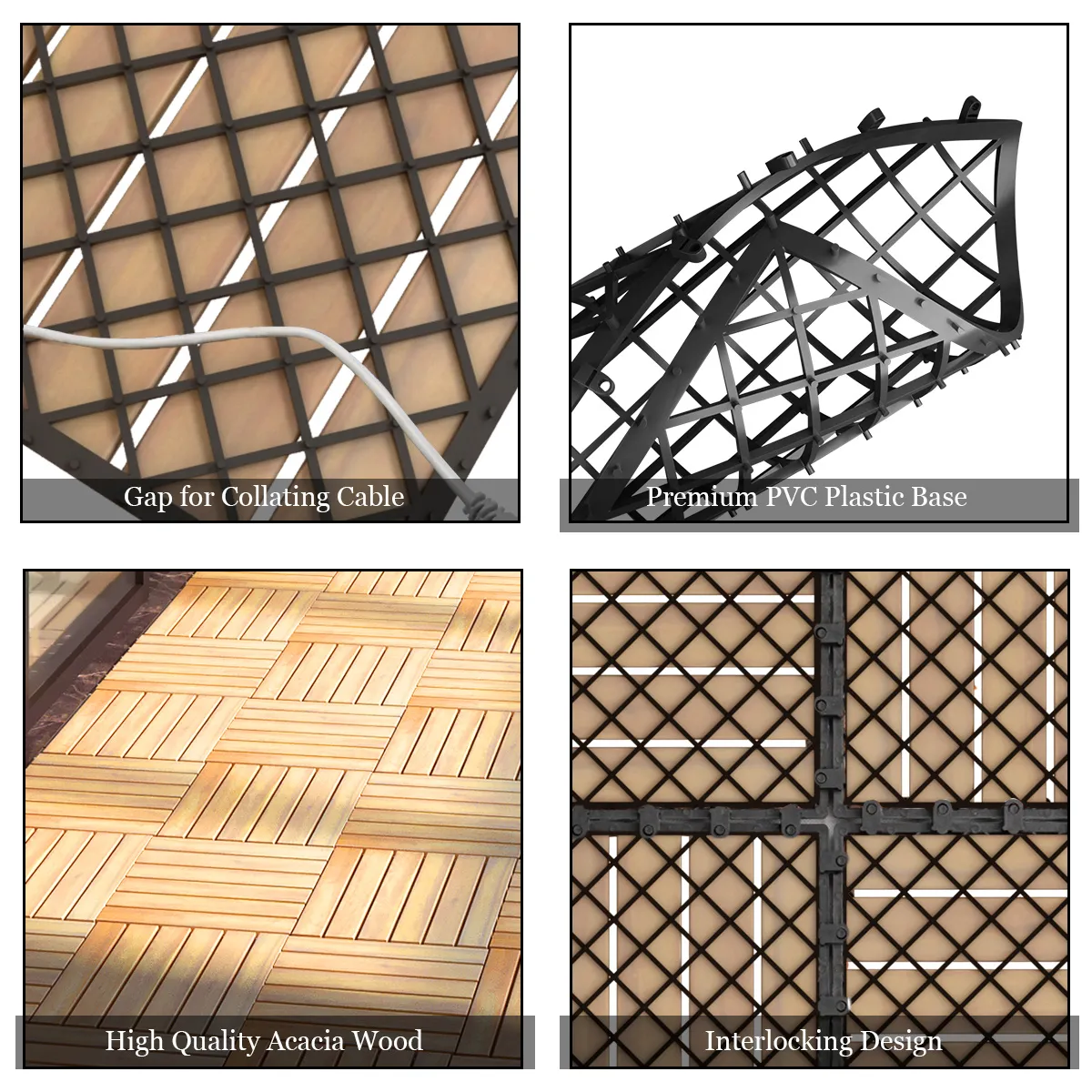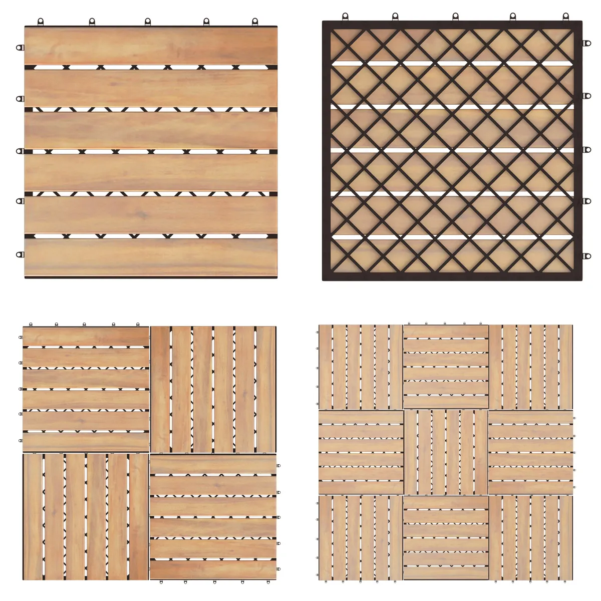 Leg uw vloer zelf: In tegenstelling tot traditionele massieve vloertegels, kunt u deze in elkaar grijpende houten tegels op elke gewenste manier mixen en matchen en het uiterlijk van uw terras in een handomdraai veranderen wanneer u hunkert naar een nieuwe look. Het hoogwaardige acaciahout straalt een natuurlijke en frisse sfeer uit die uw omgeving een rustgevende uitstraling zal geven zodat u heerlijk kunt genieten van de rust op uw terras.