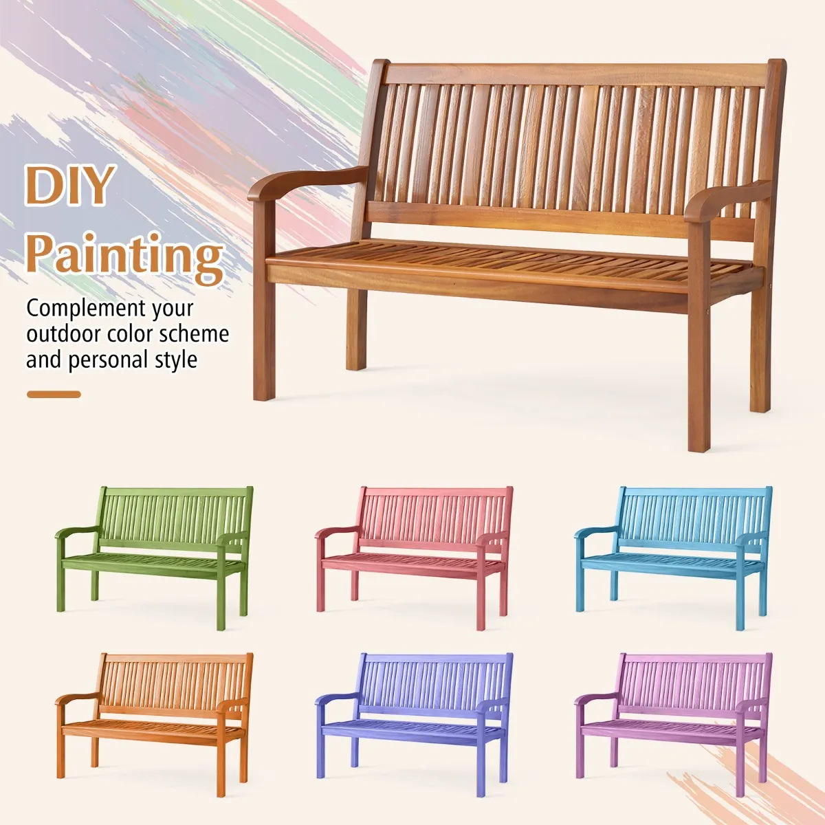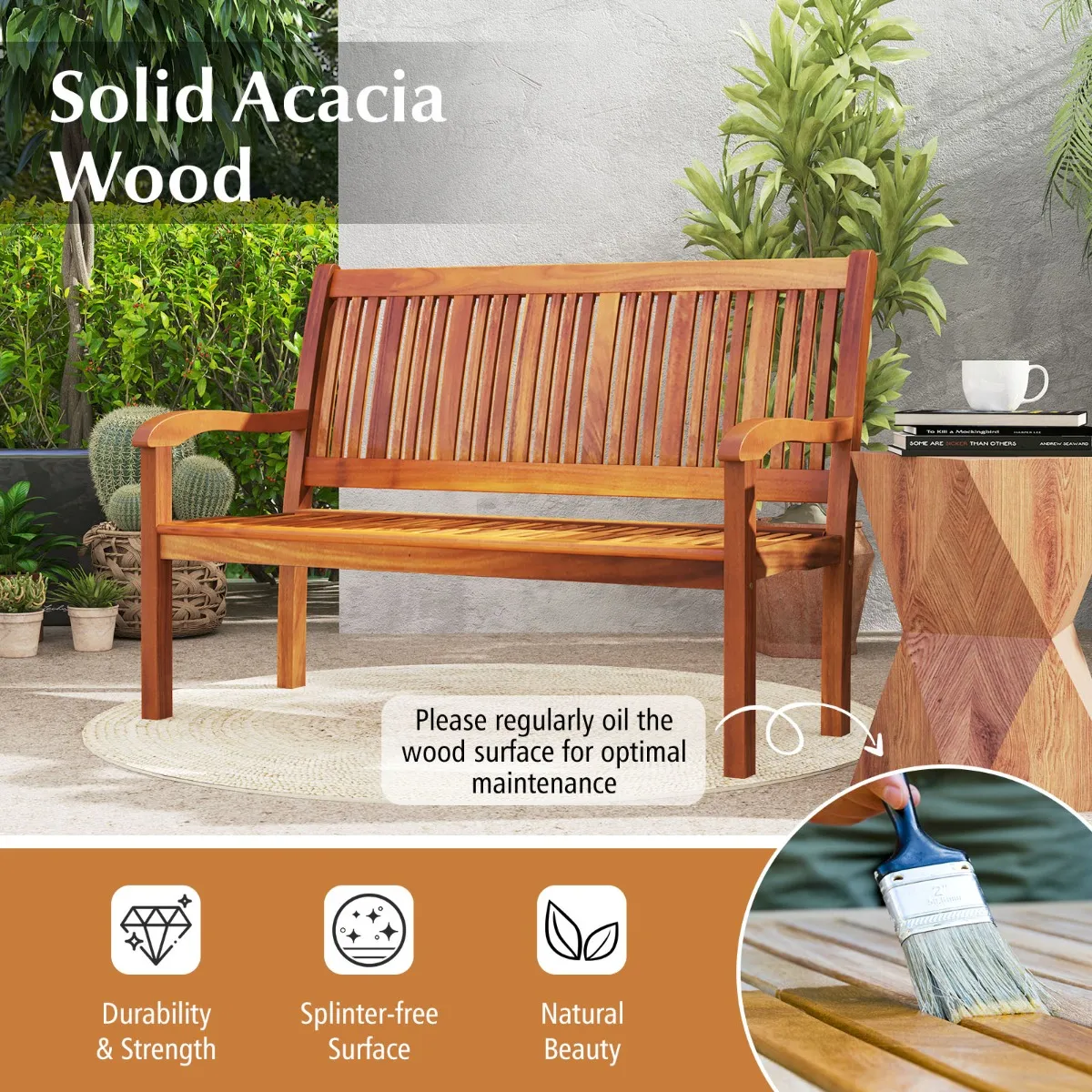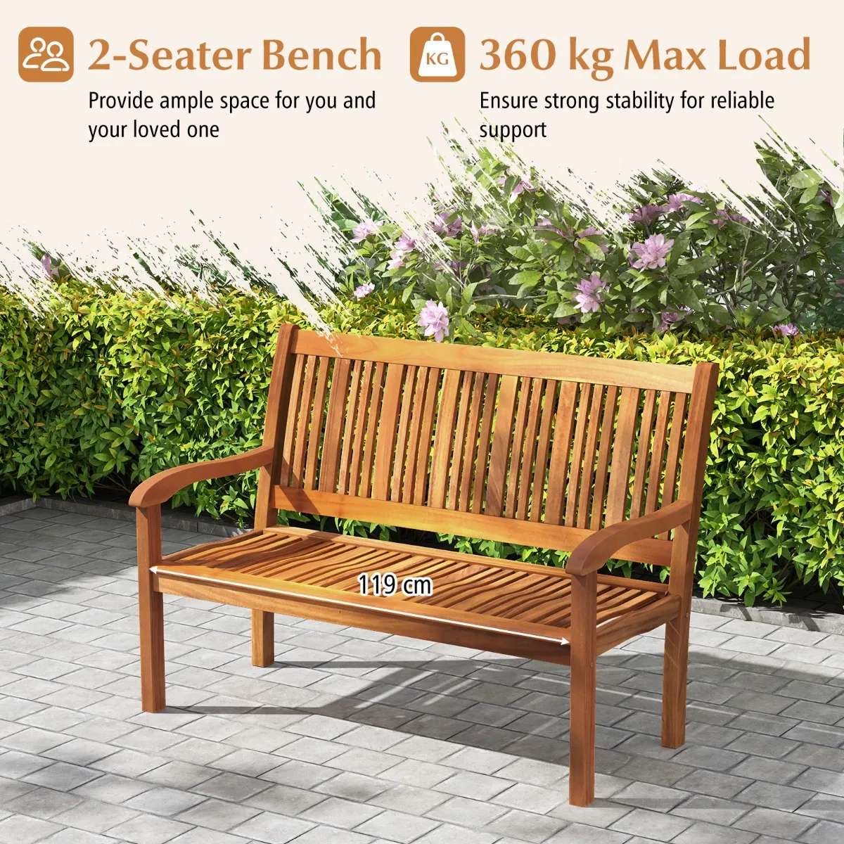 【100% massief houten frame】Ggemaakt van natuurlijke en premium acaciahout, deze buitenbank is niet gemakkelijk te beïnvloeden door vochtigheidsverandering en leidt tot scheuren. Het oppervlak van de bank is geverfd wat zorgt voor de functie van waterdicht en krasvast.