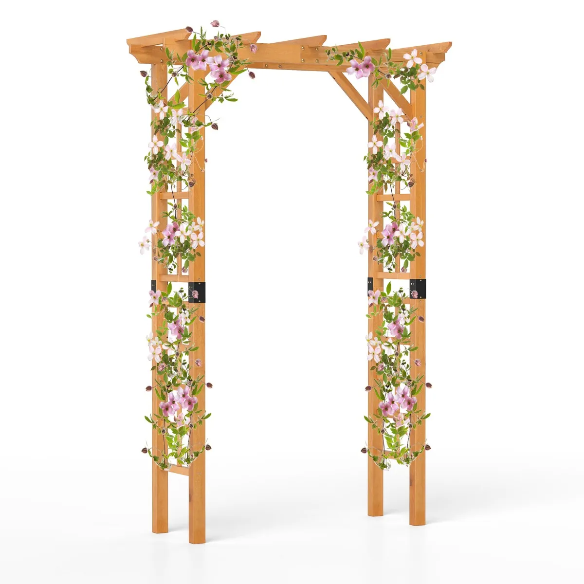 【Stevige, betrouwbare constructie】: Gemaakt van natuurlijk dennenhout en verstevigd met stevige metalen verbindingsstukken, is deze tuinboog betrouwbaar en bestand tegen kromtrekken, ontworpen om lang mee te gaan. Bovendien is het houten oppervlak behandeld met een beschermende verf om het te beschermen tegen slijtage.