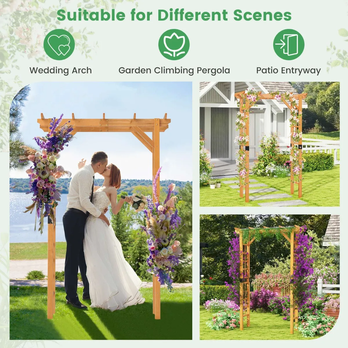 【Meerdere decoratiemogelijkheden】: Je kunt deze houten boog in je tuin of gazon plaatsen en hem een persoonlijk tintje geven door er klimplanten zoals rozen, wingerd en morning glories in te laten groeien, of hem creatief versieren met kleurrijke ballonnen, slingers en LED-lichtjes.