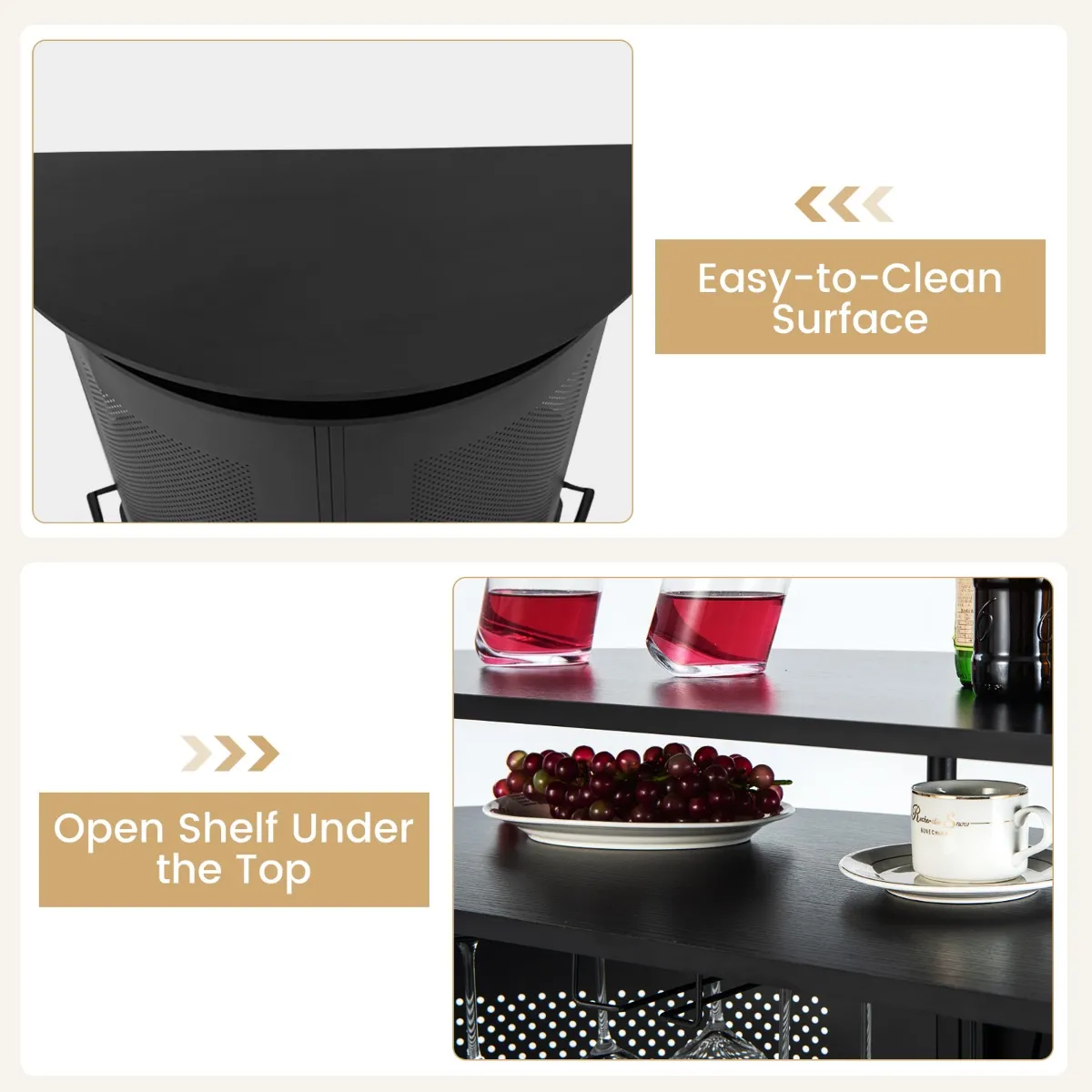 【Opbergruimte op 4 niveaus】: Deze bartafel met 4 niveaus is een ideale plek om drankjes te serveren. 1 ruim gebogen blad, 1 open plank en 2 opbergplanken bieden voldoende opbergruimte voor cocktailshakers, wijnen of ijsemmers. Bovendien bieden 3 geïntegreerde steelware houders plaats aan 9 tot 12 glazen.