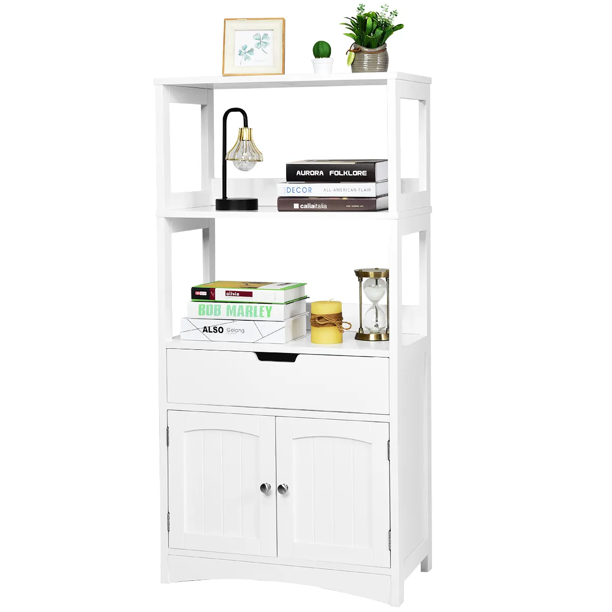 Bent u nog steeds op zoek naar een veelzijdige opbergkast om uw rommelige woning in te richten? Dan is het tijd om de beperkte ruimte ten volle te benutten en u een schoon en comfortabel huis te geven. Perfecte combinatie van milieuvriendelijk houten plaatmateriaal en verf, deze kast is duurzamer en heeft een lange levensduur. De stevige frameconstructie zorgt voor stabiliteit en een groot draagvermogen. Het belangrijkste is dat de anti-kantelinrichting en de ladestopper zijn ontworpen om u dubbele zekerheid te bieden. De lade, de planken en de gesloten kast geven u voldoende opbergruimte om uw spullen beter te kunnen indelen en ordenen. De open schappen van de kast kunnen worden gebruikt om artikelen voor dagelijks gebruik op te bergen. Het eenvoudige uiterlijk en de fijne afwerking zorgen ervoor dat de kast er stijlvol en elegant uitziet. Deze geweldige kast is een ideale keuze voor badkamer, keuken, hal, woonkamer en slaapkamer.