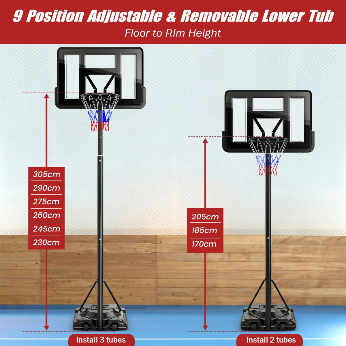 In hoogte verstelbaar op 12 niveaus: Deze basketbalring beschikt over 12 hoogteverstellingsniveaus en biedt een breed scala aan hoogtes van vloer tot ring, van 170 cm tot 305 cm, voor spelers van verschillende leeftijden en vaardigheidsniveaus. Bovendien kan de onderbuis worden verwijderd om de laagste hoogte voor jongere kinderen te bereiken.