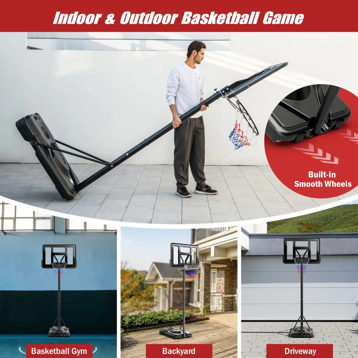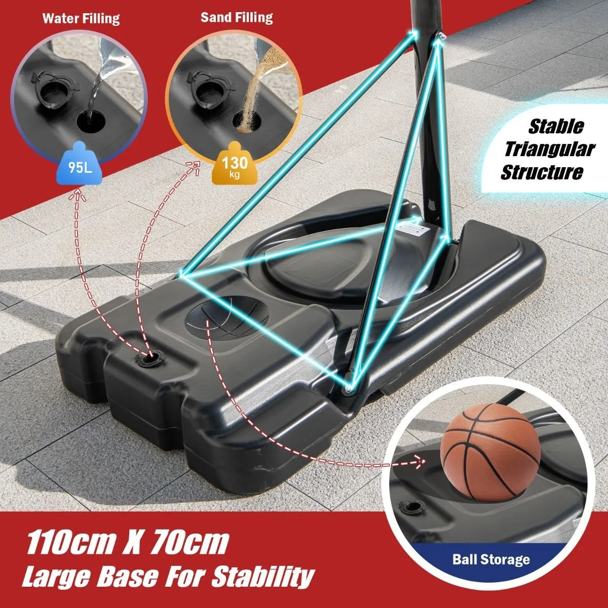 Stabiele en draagbare basis: De grote basis kan worden gevuld met 130kg zand of 95L water voor stabiliteit, en de stabiele driehoekige structuur verbetert de algehele stabiliteit verder. Bovendien maken de ingebouwde wielen het gemakkelijk om de basketbalstandaard te verplaatsen voor basketbalwedstrijden binnen en buiten, zoals: Basketbalhal, achtertuin of oprit.