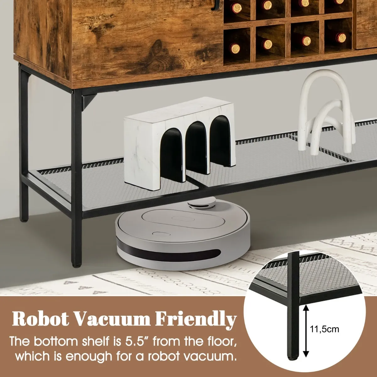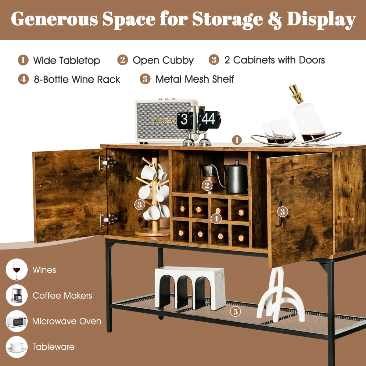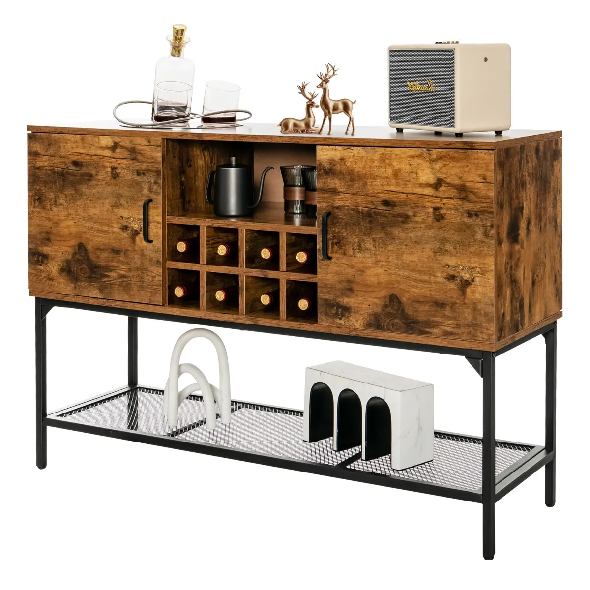 【Geklasseerde opbergruimte】Onze vrijstaande kast heeft een werkblad van 120 cm (L) x 40 cm (B), een open vak, een wijnrek voor 8 flessen en 2 zijkasten met een deur, zodat je spullen goed georganiseerd blijven en je genoeg ruimte hebt om bepaalde verzamelingen of servies uit te stallen. De metalen roosterplank onderaan zorgt ook voor extra opbergruimte.