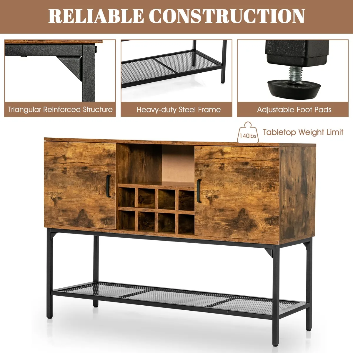 【Stevige en stabiele constructie】Het dressoir is gemaakt van hoogwaardige materialen en garandeert een lange levensduur. En de lagere metalen constructie zorgt ervoor dat het niet snel zal instorten of wiebelen. Het roestbestendige metalen frame biedt sterke ondersteuning en garandeert een hoge duurzaamheid. Verstelbare voetkussentjes helpen ook om het meubel stabiel te houden op een oneffen ondergrond.