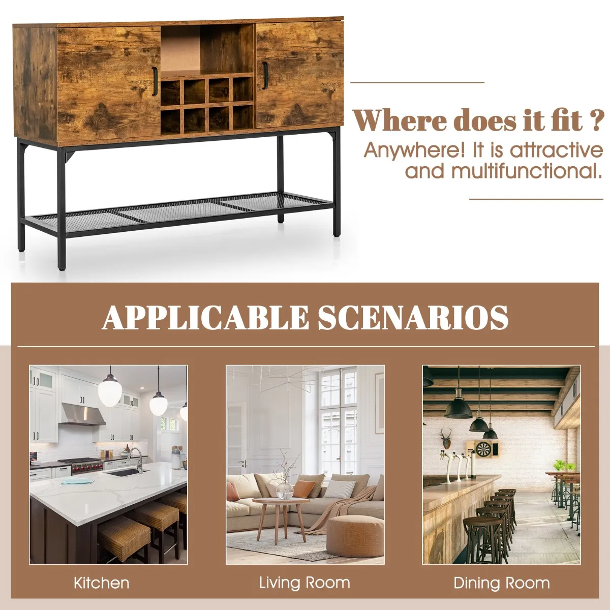 Onze multifunctionele kast is een ideale opbergoplossing voor jou en je gezin. Je kunt hem gebruiken als dressoir, kast of consoletafel, afhankelijk van je verschillende behoeften. Hij heeft veel opbergruimte, waaronder een breed werkblad, een open schap, een wijnrek voor 8 flessen, twee deurkastjes en een onderste metalen roosterplank. Dit betekent dat je er vrij je wijn, fruit, glazen, inmaakpotten of servies op kunt zetten. Bovendien zorgen 2 deuren met praktische handgrepen voor veel gemak. En dankzij de metalen scharnieren kun je de deuren gemakkelijk openen en sluiten. Gemaakt van hoogwaardige materialen met een stevig metalen frame, zal deze kast jou en je gezin jarenlang goed van dienst zijn. Bovendien zorgen verstelbare voetkussentjes voor meer stabiliteit.