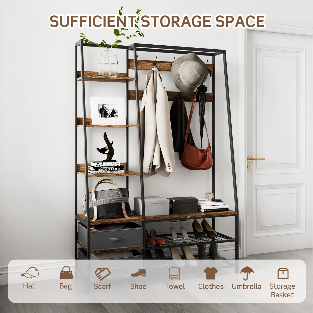 Bent u op zoek naar een veelzijdige garderobe om uw spullen goed georganiseerd te houden? Onze multifunctionele gangkast is een perfecte opbergoplossing. Het is voorzien van 9 dubbele haken, 6 legplanken, 2 opvouwbare ladekasten, 1 schoenenbank en een schoenenrek van 2 niveaus zodat u uw hoeden, tassen, kleding, schoenen en meer kunt ophangen of neerzetten. U kunt ook op de bank zitten om comfortabel van schoenen te wisselen of hem gebruiken als een gewone opbergplank. Als u meer ruimte nodig hebt om uw ornamenten uit te stallen, kunt u de stoffen bakken gemakkelijk verwijderen. Bovendien is onze kapstok gemaakt van stevige stalen en houten materialen die sterk en duurzaam genoeg zijn om u en uw gezin lang van dienst te zijn. Bovendien heeft deze kapstok een anti-tip waardoor hij stabiel en veilig te gebruiken is. En de planken met opstaande randen helpen voorkomen dat voorwerpen vallen. Met een glad en waterdicht oppervlak is de kapstok ook gemakkelijk schoon te maken.