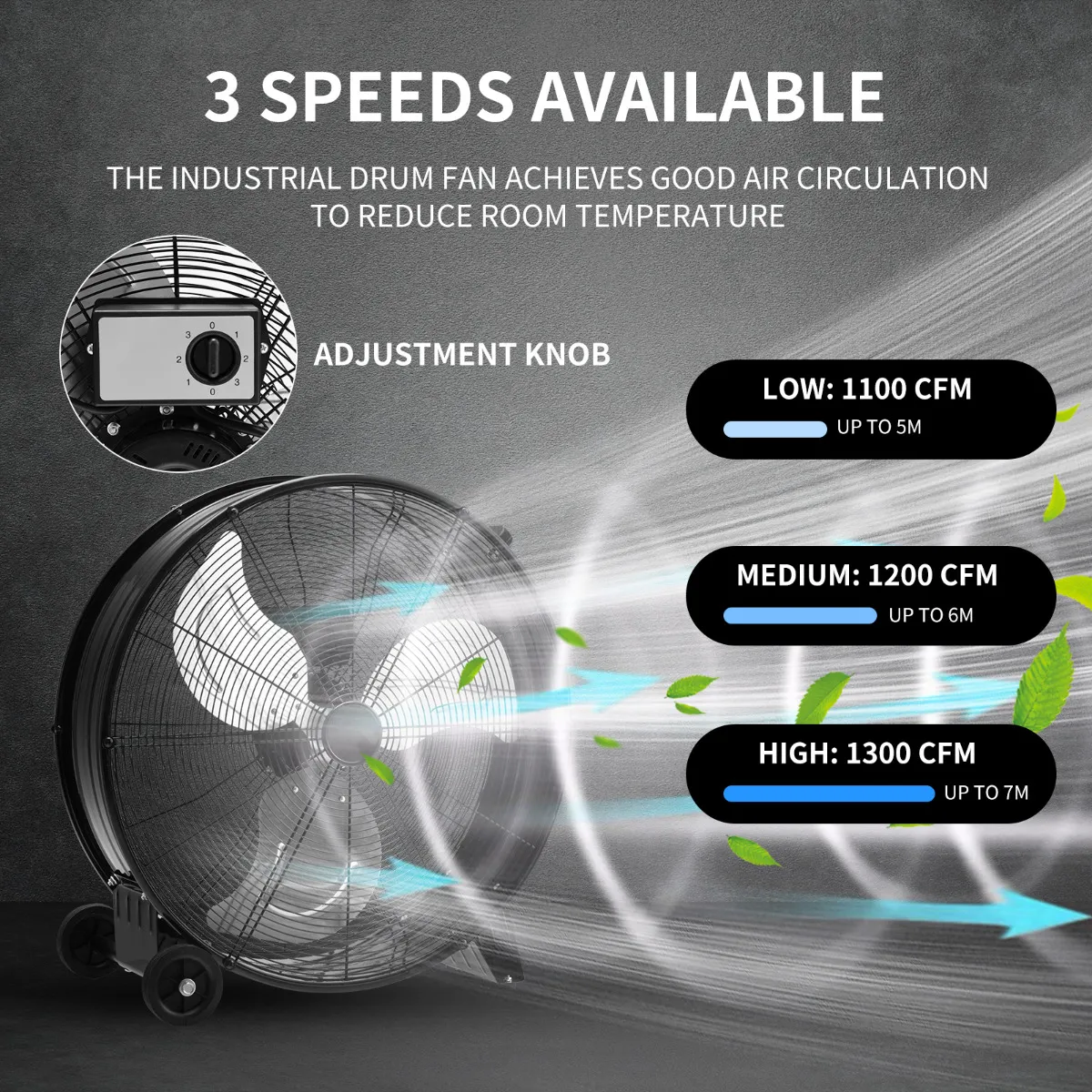 【3 sterke windsnelheden】: Met de instelknop kan de windsnelheid worden ingesteld op hoog, gemiddeld of laag. In het bijzonder, de hoge snelheid biedt maximale 1300 CFM en lucht levering afstand tot 7m. Daarom is de direct aangedreven trommelventilator een perfecte keuze voor het koelen van de hele werkplaats.
