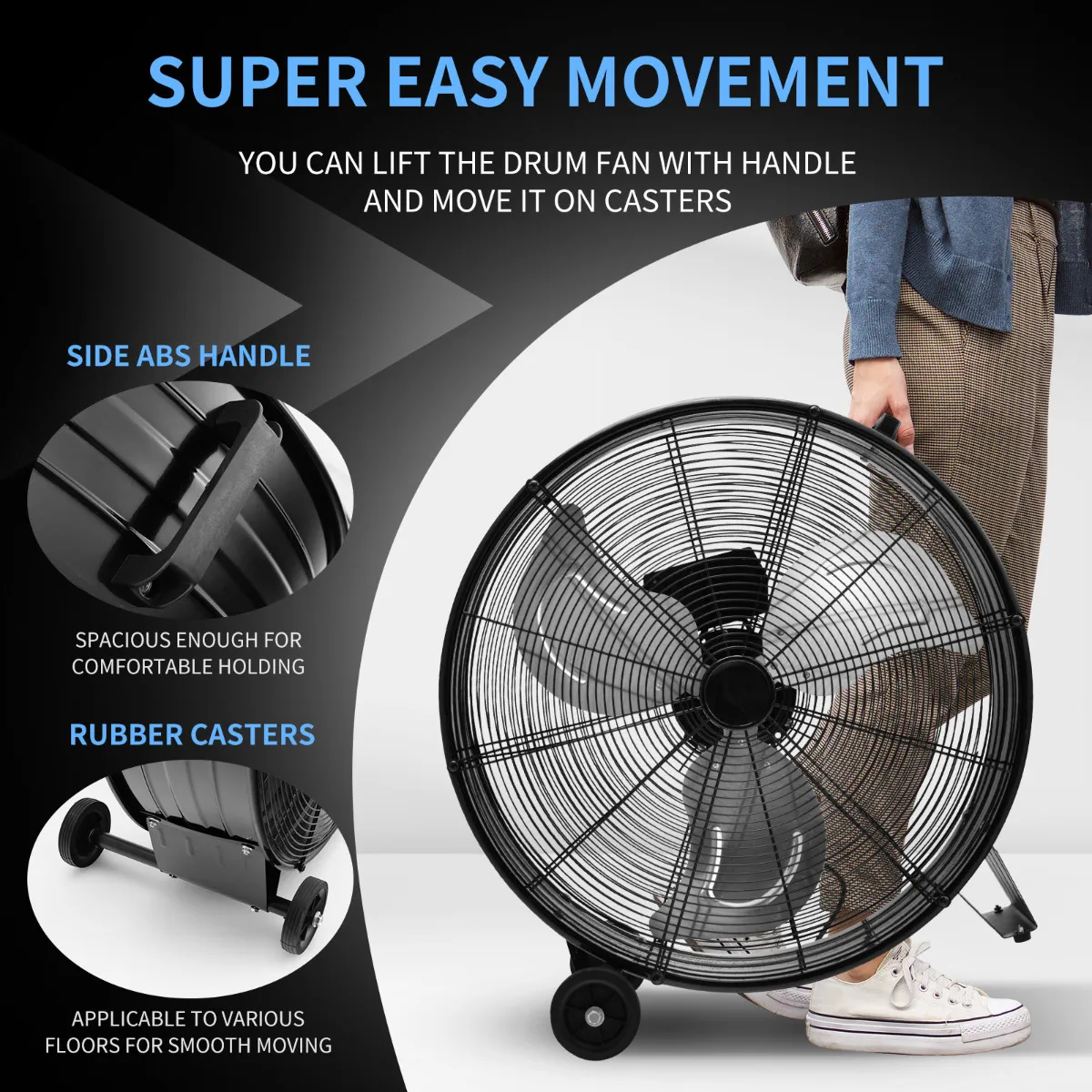【Moeiteloze beweging】: Om de trommelventilator gemakkelijker te kunnen verplaatsen, is hij uitgerust met een ABS-handgreep aan de zijkant voor een comfortabele grip en twee rubberen wielen voor een soepele verplaatsing. Aangezien de totale afmeting 65 x 37 x 67 cm is, kunnen de meeste mensen van verschillende lengte de trommelventilator optillen en rondtrekken.