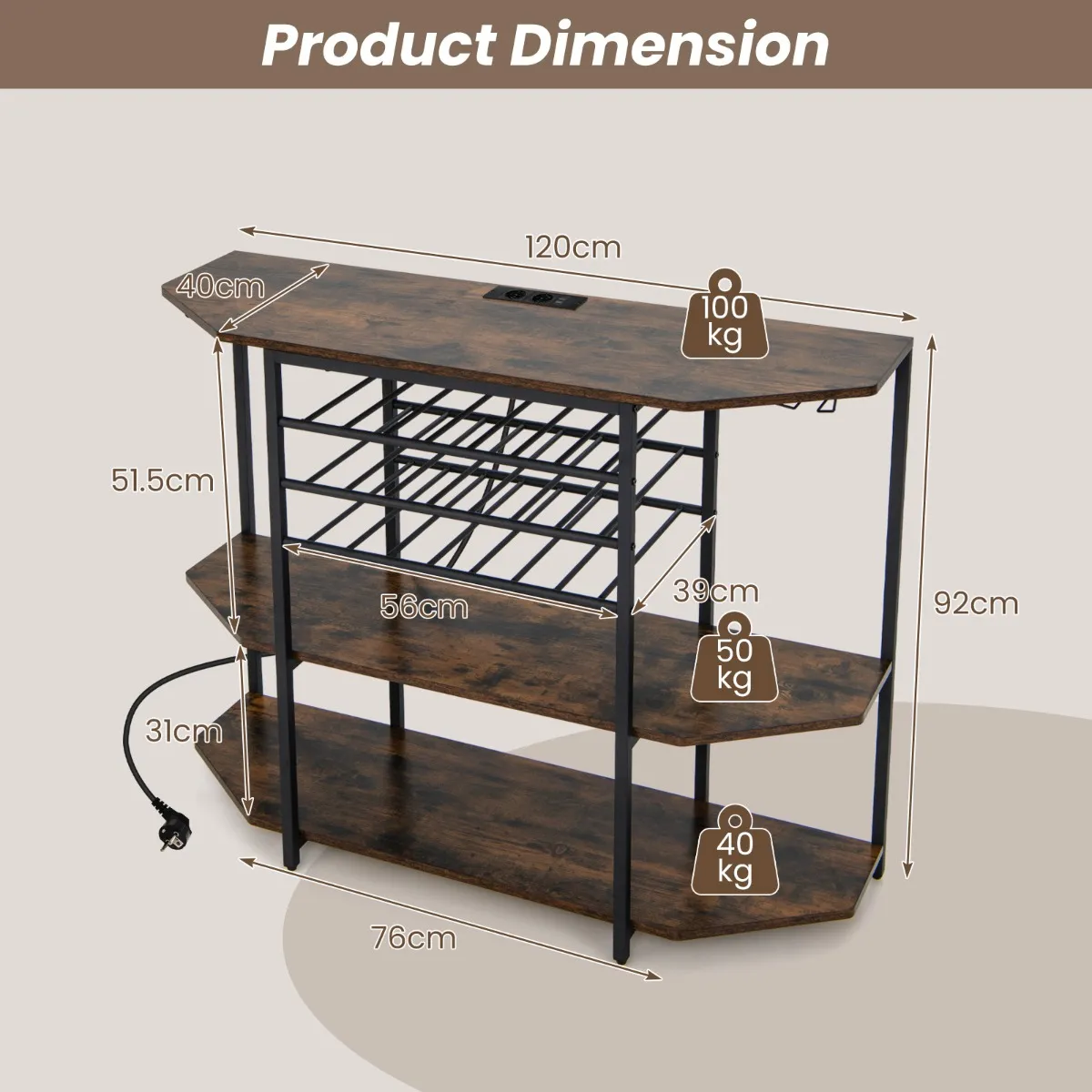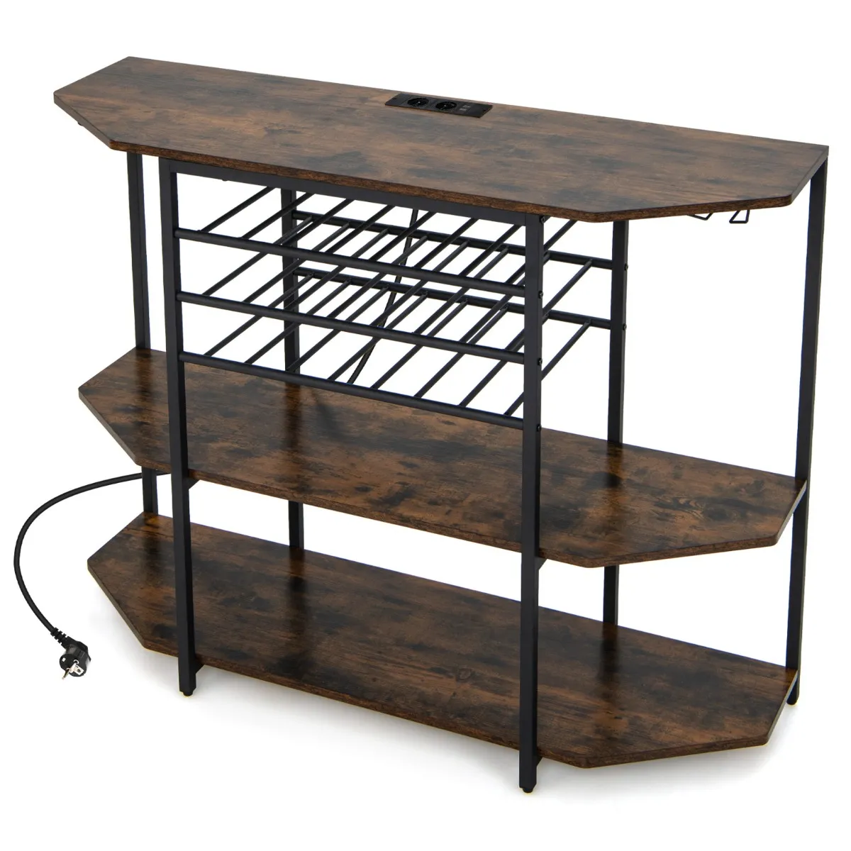 Ons stijlvolle en functionele wijnrek met geïntegreerd oplaadstation voldoet aan al je behoeften. Met glazenhouders aan beide zijden voor 8 glazen, een opbergrek voor 21 flessen wijn en 3 grote planken voor het organiseren van keukengerei is het perfect voor elke ruimte. Dankzij het geïntegreerde oplaadstation met 2 stopcontacten en 2 USB-poorten zit je nooit zonder stroom voor je smartphones, koffiezetapparaat en baraccessoires. Het kan niet alleen worden gebruikt als wijnrek, maar ook als barstandaard, koffiebar of consoletafel.