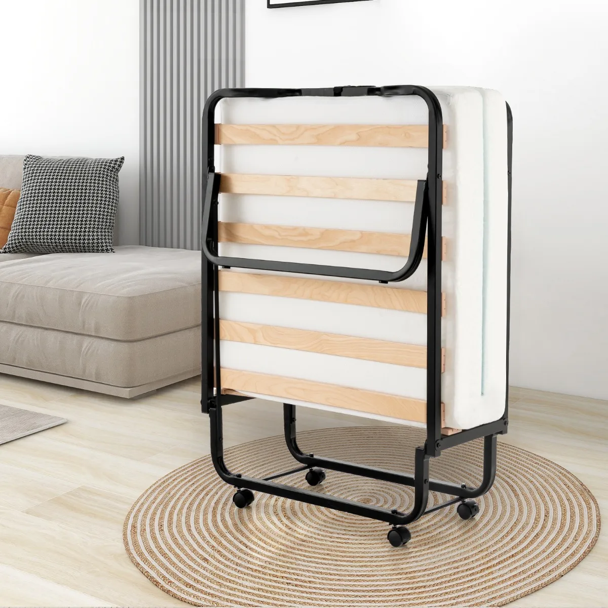 Het logeerbed bestaat uit een robuust metalen frame en 15 massieve berkenhouten latten en is daarom super stabiel om 220 kg gewicht zonder piepen te dragen. Ook zijn antislip voetkussens verbeteren de totale stabiliteit. Het uitrolbare bed wordt geleverd met een 10 cm dikke schuimstofmatras, die is voorzien van een machinewasbare polyesterhoes. Dankzij de anti-valbalk en klittenbandsluitingen glijdt de matras niet zo gemakkelijk weg. Na gebruik kun je hem moeiteloos opvouwen en ruimtebesparend opbergen. Dankzij de 4 PP-wielen (inclusief 2 vergrendelbare wielen) kan hij in huis zeer eenvoudig worden geschoven. Ten slotte is het mogelijk om de matras door je eigen te vervangen.