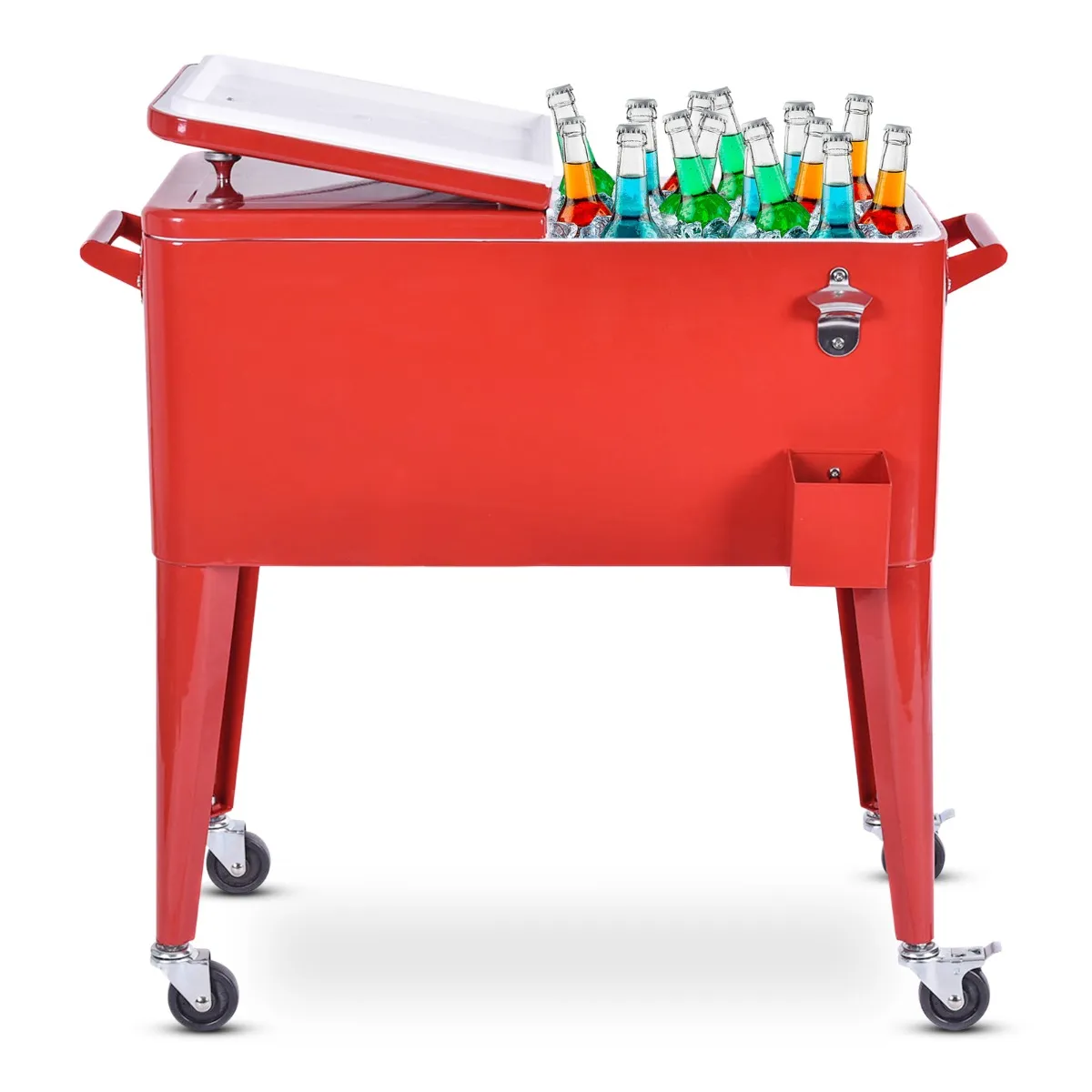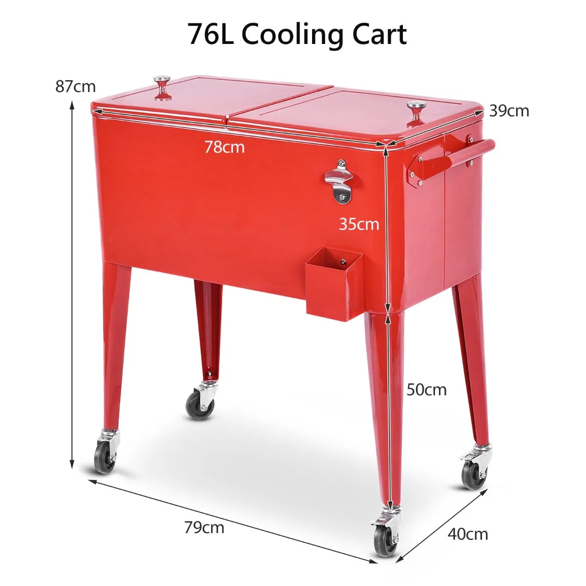 Onze rollende geïsoleerde trolley kan veel drankjes bevatten, waar je ook naartoe gaat. Hij is gemaakt van duurzaam metaal met een rode afwerking en is de perfecte metgezel voor elke buitenactiviteit. Deze koelbox van 76 liter heeft 2 openingen en praktische handgrepen aan elke kant. Met een afvoergat aan de achterkant kun je snel overtollig water verwijderen, terwijl aan de voorkant een handige flesopener met kurkvanger is bevestigd. Hij heeft 4 wielen zodat je hem overal mee naartoe kunt nemen, en 2 vergrendelbare wielen om hem op zijn plaats te houden.