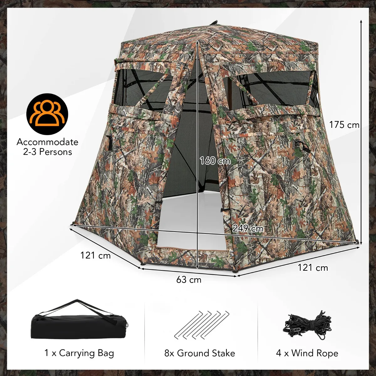 [Uitgebreide binnenruimte]: Met een verlengd ontwerp met 4 extra kleine zijden naast de 4 grote zijden, maximaliseert deze jachthut de binnenruimte. Met een volledig vergroot vloeroppervlak van 208 x 208 cm, een hoogte van 175 cm en een naaf-tot-naaf afmeting van 186 x 186 cm, biedt hij comfortabel plaats aan 2 tot 3 personen.