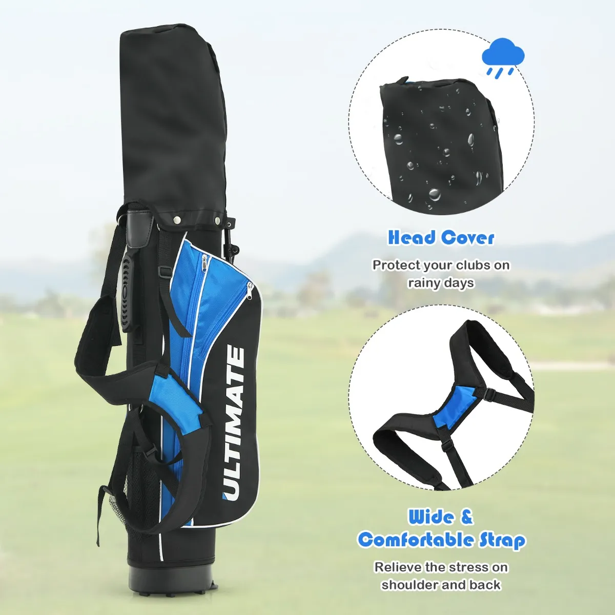 Draagbare tas en gering gewicht:Â In de golftas kan alles gemakkelijk worden vervoerd. Omdat de kindergolfset zeer licht is, kunnen de kinderen hem probleemloos zelf dragen. Door de verstelbare riemen is hij geschikt voor verschillende lichaamslengtes.