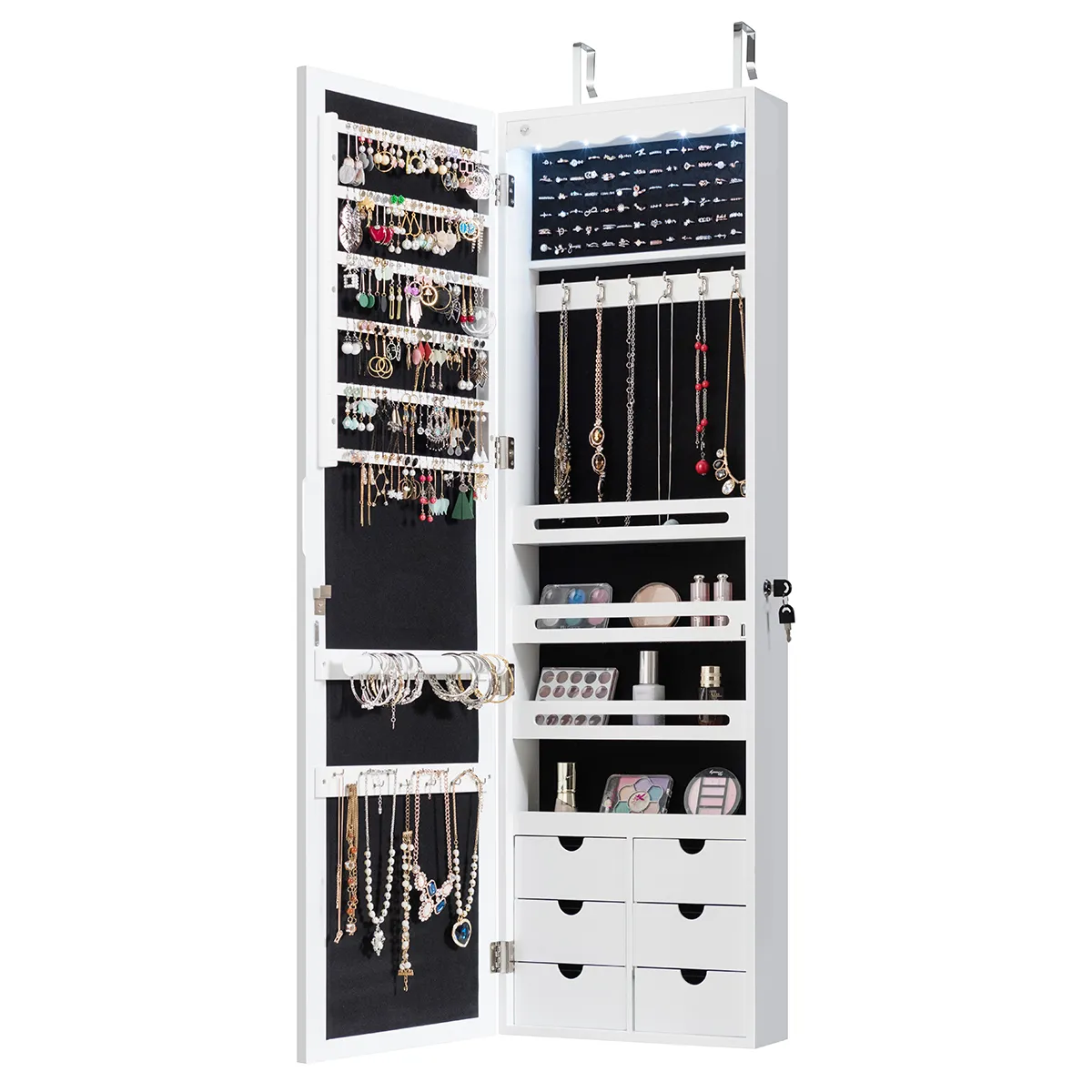 Gemaakt van hoogwaardig MDF, is deze juwelenkast uiterst robuust en duurzaam. Dankzij de vele vakken en het geïntegreerde slot kunt u al uw favoriete accessoires afzonderlijk, veilig en overzichtelijk opbergen. U kunt de kast boven de deur hangen met haken of aan de muur bevestigen met schroeven, wat ook ruimte bespaart. Bovendien helpen de 5 automatische lichten u de juiste juwelen te kiezen om ze beter te vinden, zelfs in het donker, of om ze dynamisch in te stellen in een scène met licht. De full body spiegel geeft u een uitstekend overzicht van uw uiterlijk en maakt het gemakkelijker om uw sieraden met uw kleding te combineren.