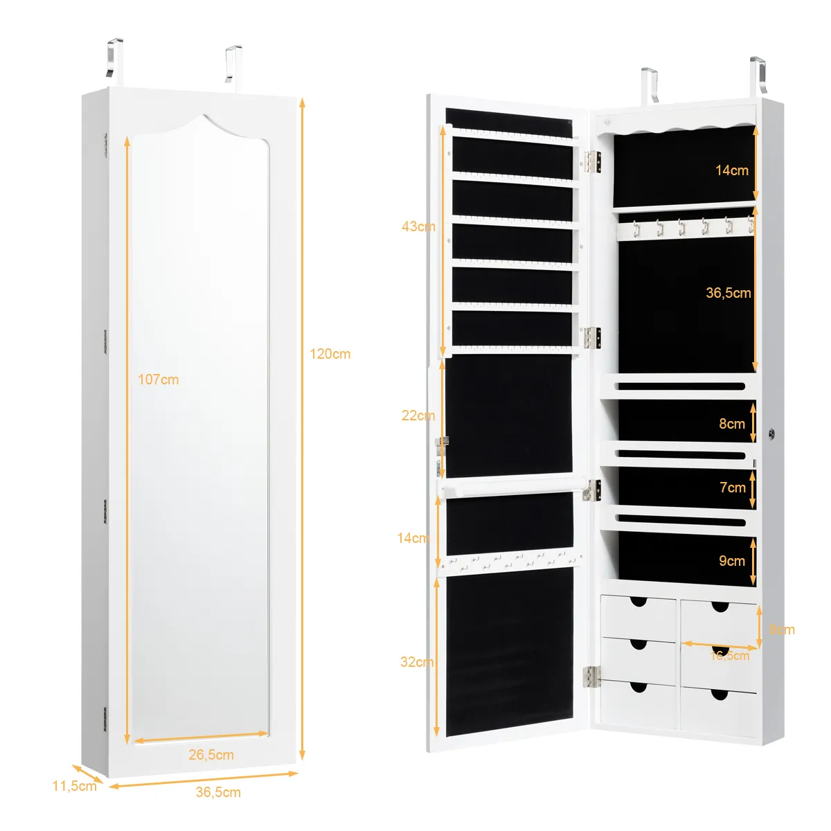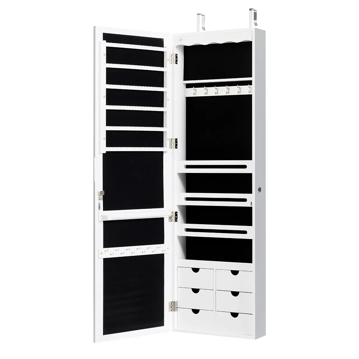 Ruimtebesparend ontwerp: U kunt de sieradenkast met de meegeleverde haken over de deur hangen of met schroeven aan de muur bevestigen om daarbij optimaal ruimte te besparen.