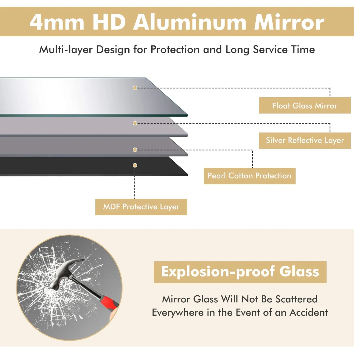 Explosiebestendig glas: Om jouw veiligheid en die van anderen te garanderen, heeft deze staande spiegel explosiebestendig glas, dat veiliger en sterker is dan gewoon glas. Zelfs als het glas breekt door een externe kracht, zal het glas om veiligheidsredenen niet vallen.
