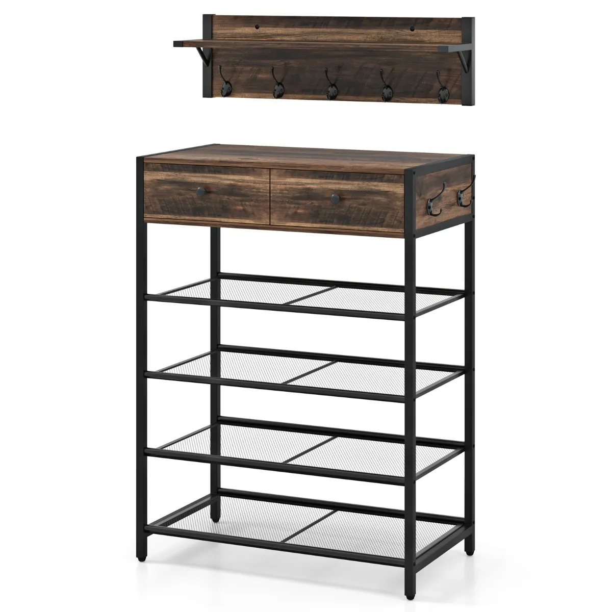 De set van een kapstok en schoenenrek bestaat uit een zwevende plank, 7 hanghaken, 2 lades en 4 planken. Het metalen schoenenrek is verstevigd met 2 anti-kantelsets en verstelbare glijders. De wandmontageset voor de kapstok is inbegrepen voor eenvoudige installatie. Afhankelijk van uw behoeften is de schoenenopberger met kapstok perfect voor in de hal of slaapkamer. De houtstructuur voegt een vleugje rustieke elegantie toe, terwijl het eenvoudig te reinigen oppervlak dit halmeubel tot een praktische en stijlvolle keuze maakt.