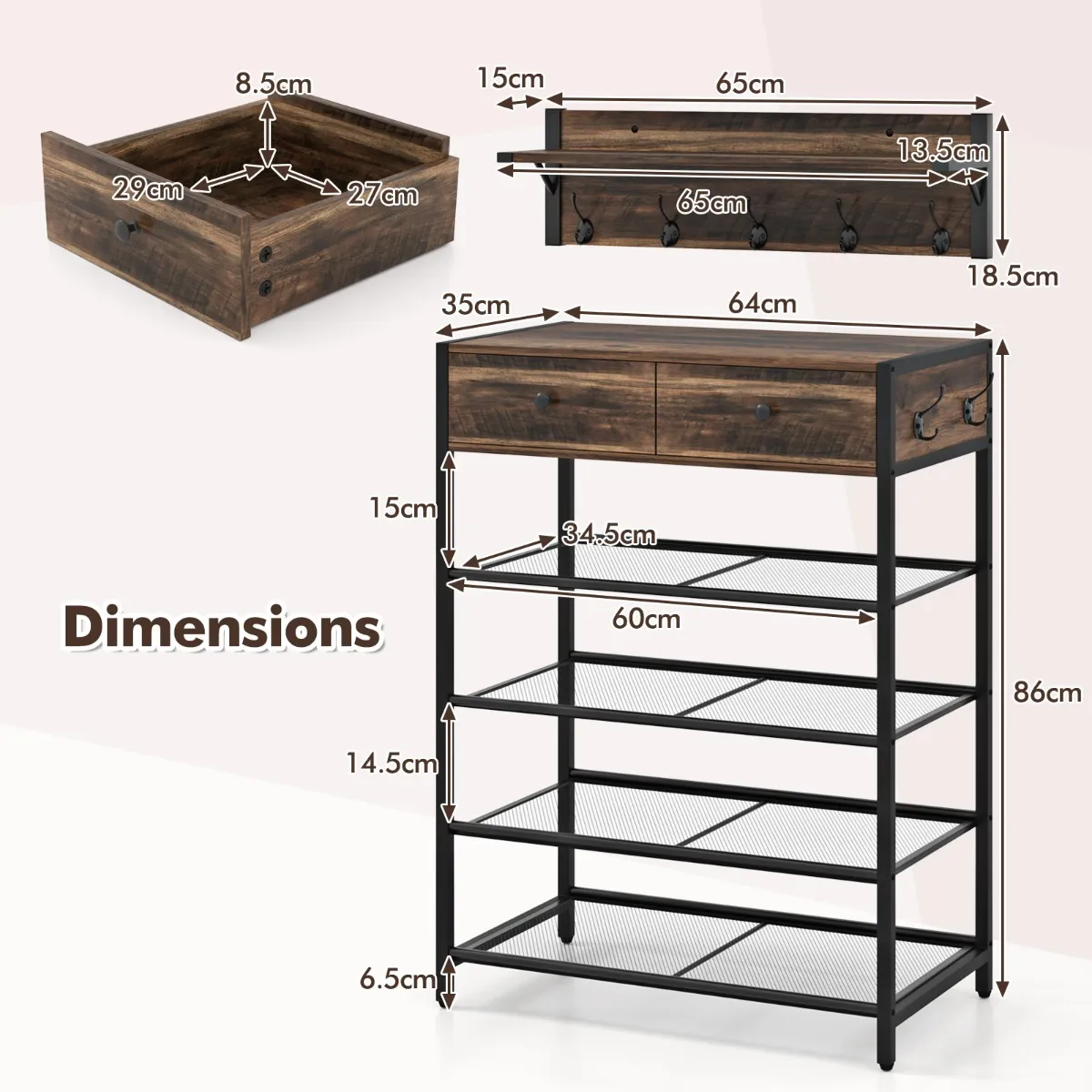 【Alles-in-één opbergontwerp】: Dit multifunctionele meubelstuk bevat niet alleen een stevige kapstok met 5 haken voor bovenkleding en tassen, maar ook een schoenenrek met 2 lades, 2 zijhaken en 4 metalen planken, wat voor voldoende opbergmogelijkheden zorgt.