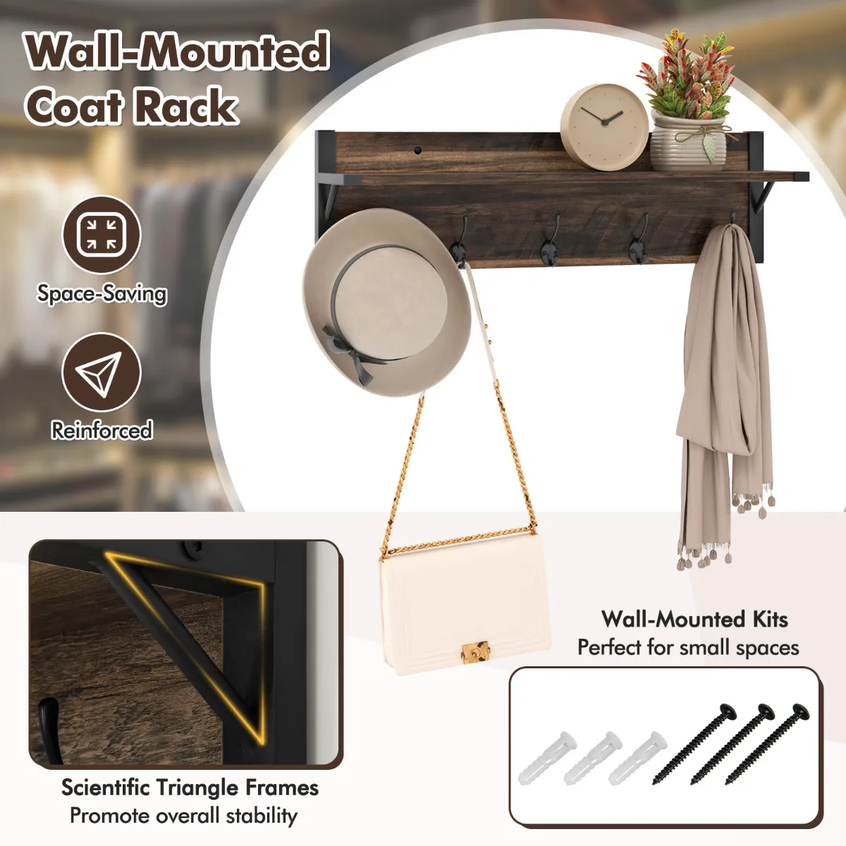 De aan de muur te bevestigen kapstok combineert een zwevende plank en 5 ophanghaken