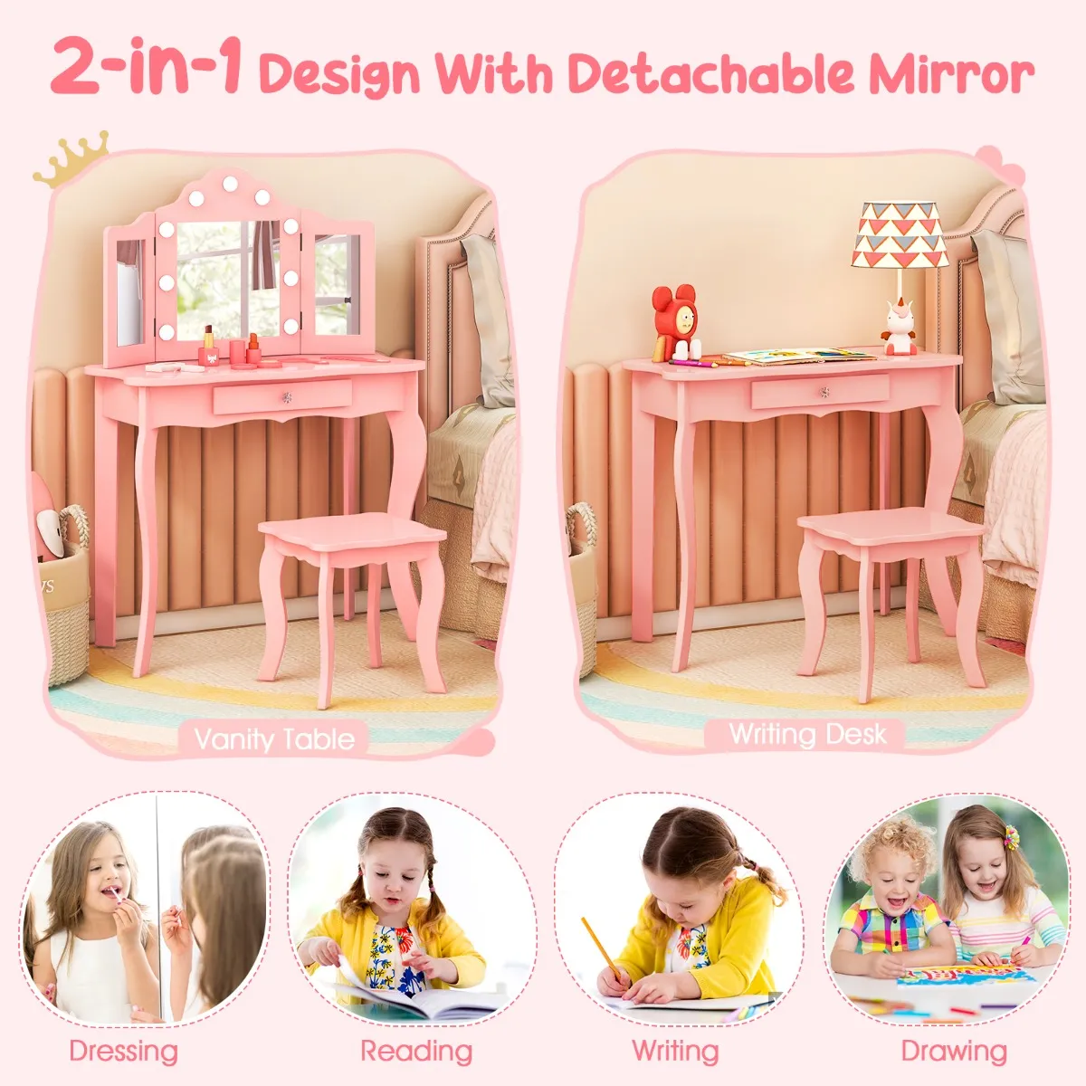 2-in-1 ontwerp met afneembare spiegel: Met een afneembare spiegel kan deze make-up ijdelheid voor kinderen ook gebruikt worden als schrijftafel. En deze kinderbadjesset is geschikt voor verschillende activiteiten, zoals aankleden, lezen, tekenen, studeren en nog veel meer.