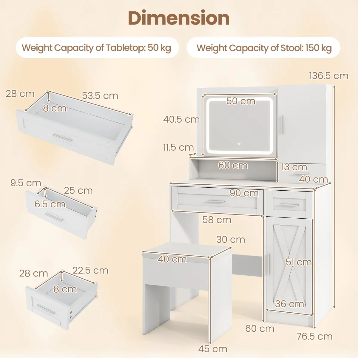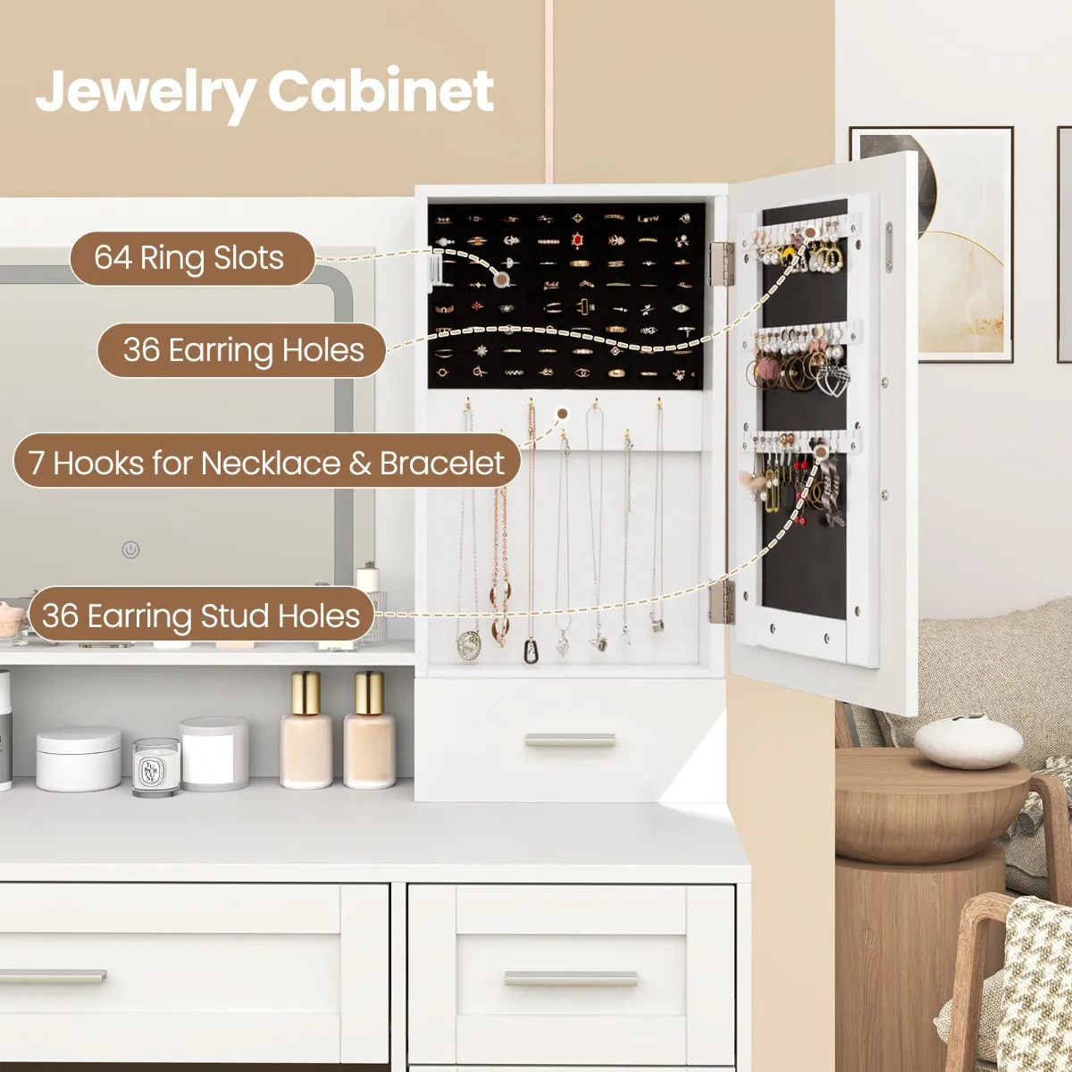 Deze make-uptafel heeft een ingebouwd oplaadstation met 2 USB-poorten en 2 stopcontacten om je apparaten gemakkelijk op te laden. De LED-verlichte HD-spiegel biedt instelbare helderheid en 3 kleuropties om aan je behoeften te voldoen. Je kunt georganiseerd blijven met voldoende opbergruimte, waaronder een sieradenkastje, lades, een open plank en nog veel meer. Deze stijlvolle en praktische kaptafelset is een perfect cadeau voor je geliefden bij speciale gelegenheden.