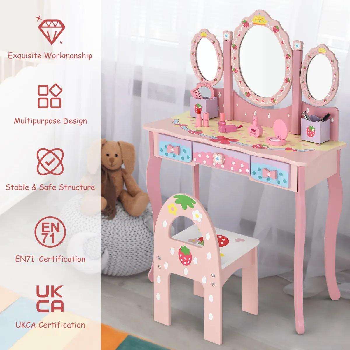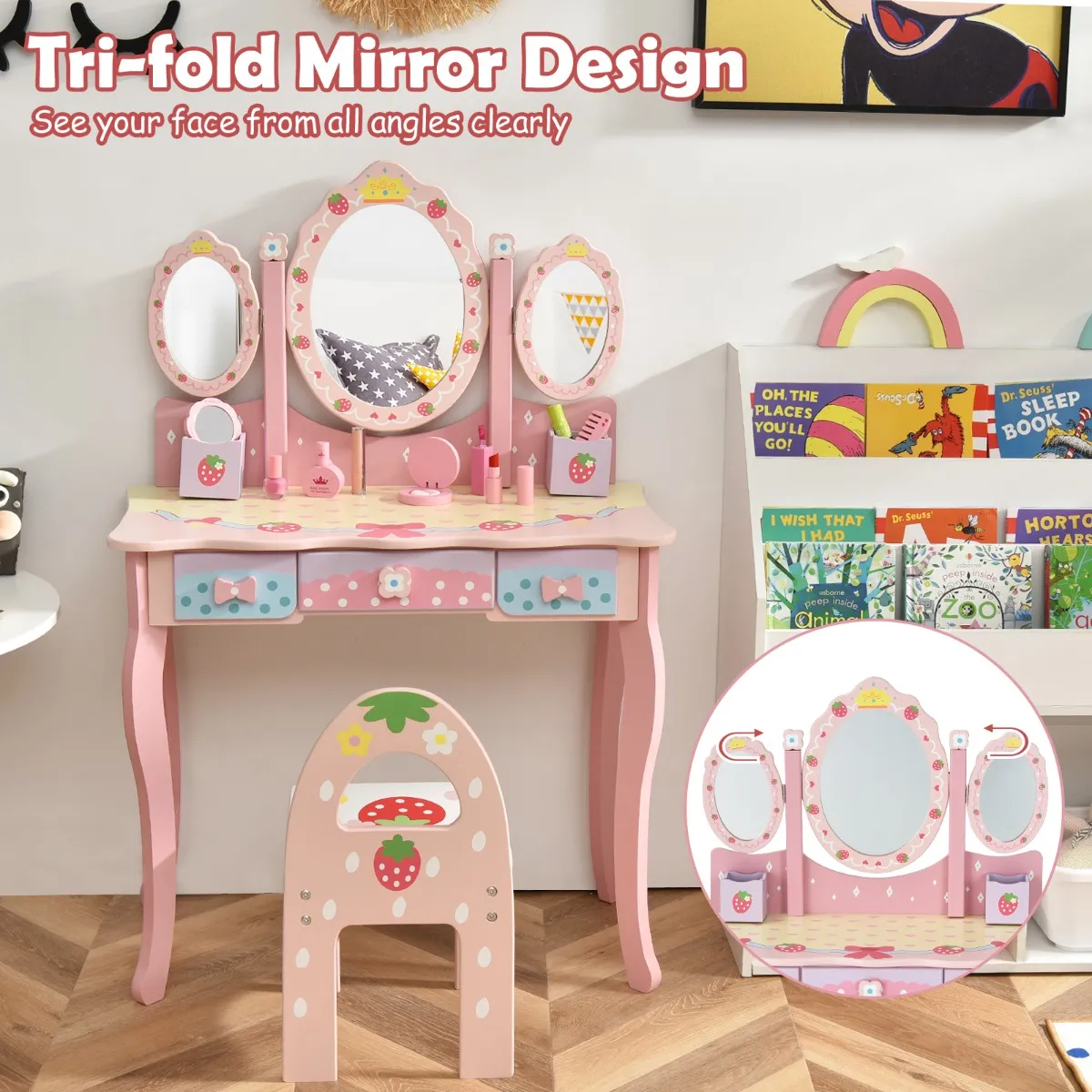 Creëer een veelzijdige en veilige ruimte voor je kind met onze 2-in-1 kaptafel. Hij verandert naar behoefte in een bureau en biedt een multifunctionele ruimte voor activiteiten als aankleden, lezen, schrijven en tekenen. De 3-voudige spiegel biedt een onbelemmerd zicht met een grote centrale spiegel en 2 zijspiegels. De veiligheid wordt gegarandeerd door een anti-kantelontwerp en een onbreekbare acrylspiegel. Er is veel opbergruimte met lades en vakken, en de bijpassende stoel biedt maximaal comfort met een hoge rug en brede zitting.