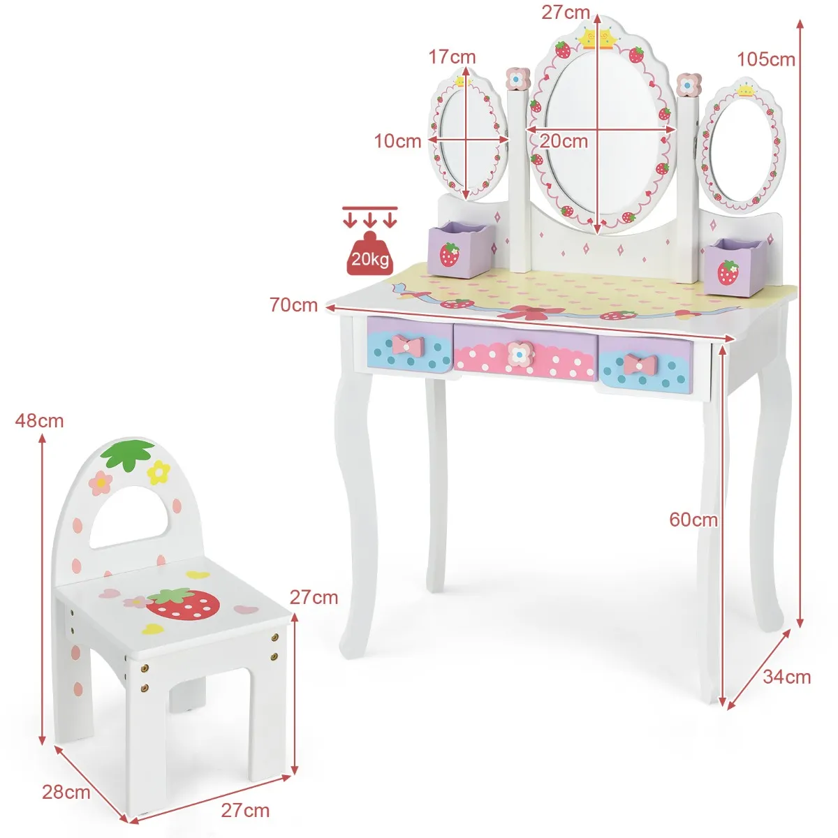 De prachtige MDF constructie biedt voldoende ondersteuning en veiligheid. Het grote bureaublad is een geweldige plek voor de dagelijkse benodigdheden, terwijl de 3 laden een afgesloten ruimte bieden om de persoonlijke spullen van uw kind te beschermen en verlies te voorkomen. Bovendien zorgen de drie spiegels, waarvan er 2 in 90 graden verstelbaar zijn, ervoor dat uw kleintjes hun schoonheid vanuit elke hoek kunnen zien. U kunt de spiegel ook verwijderen om er een leerbureau van te maken voor extra gebruik. Als u op zoek bent naar een dergelijk product, aarzel dan niet en koop het nu.