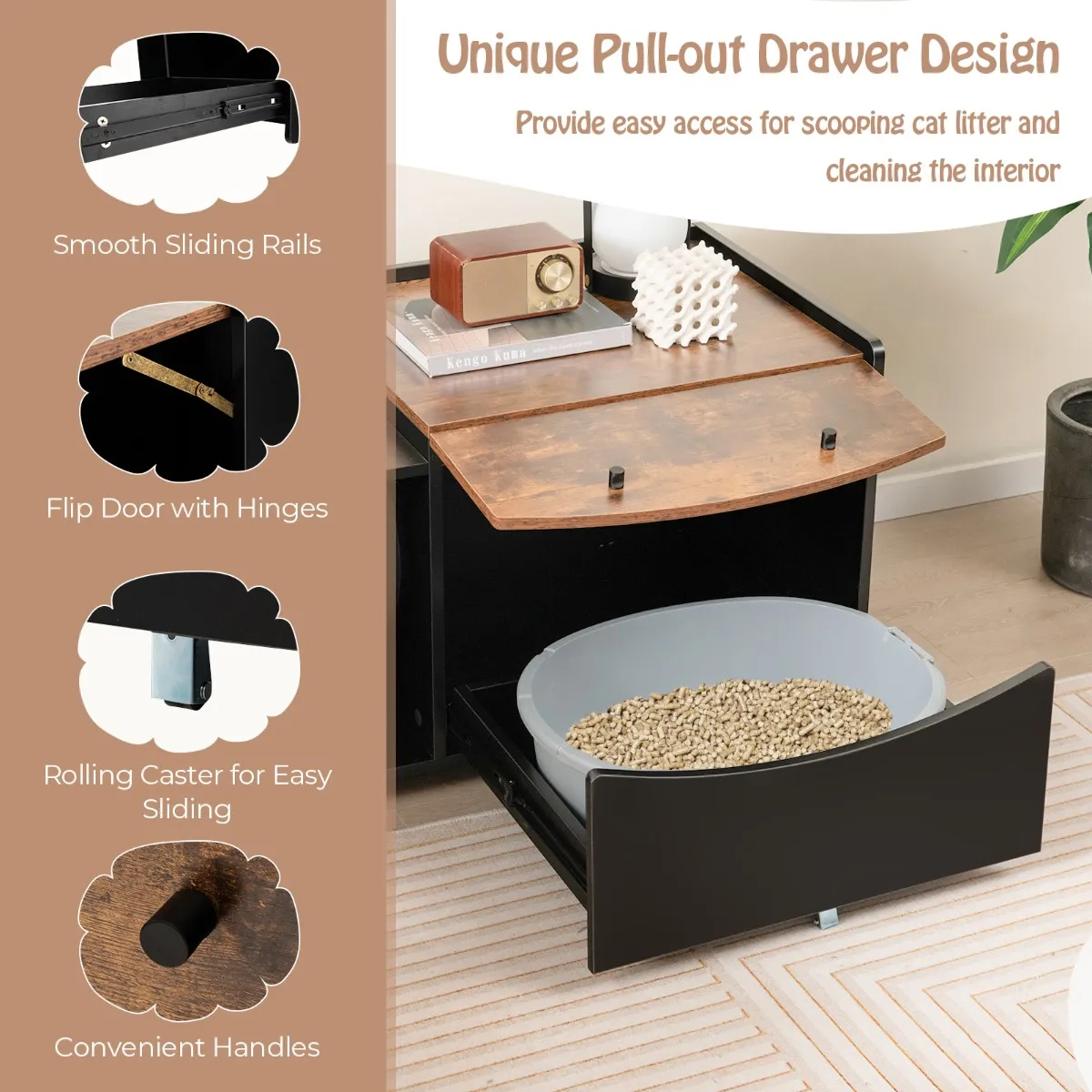 Uniek ontwerp met schuiflade: De kattenbakkast heeft een unieke lade met gladde schuifrails en wieltjes, zodat je gemakkelijk kattenbakvulling kunt opscheppen en de binnenkant kunt schoonmaken. Bovendien is hij ontworpen met een praktische klapdeur en handgrepen die gemakkelijk te openen en te sluiten zijn.