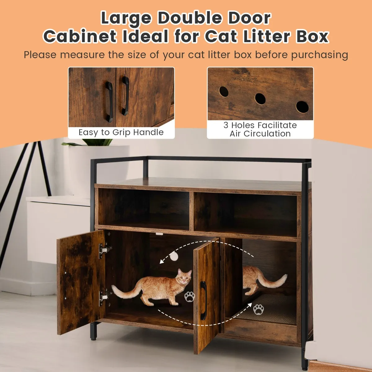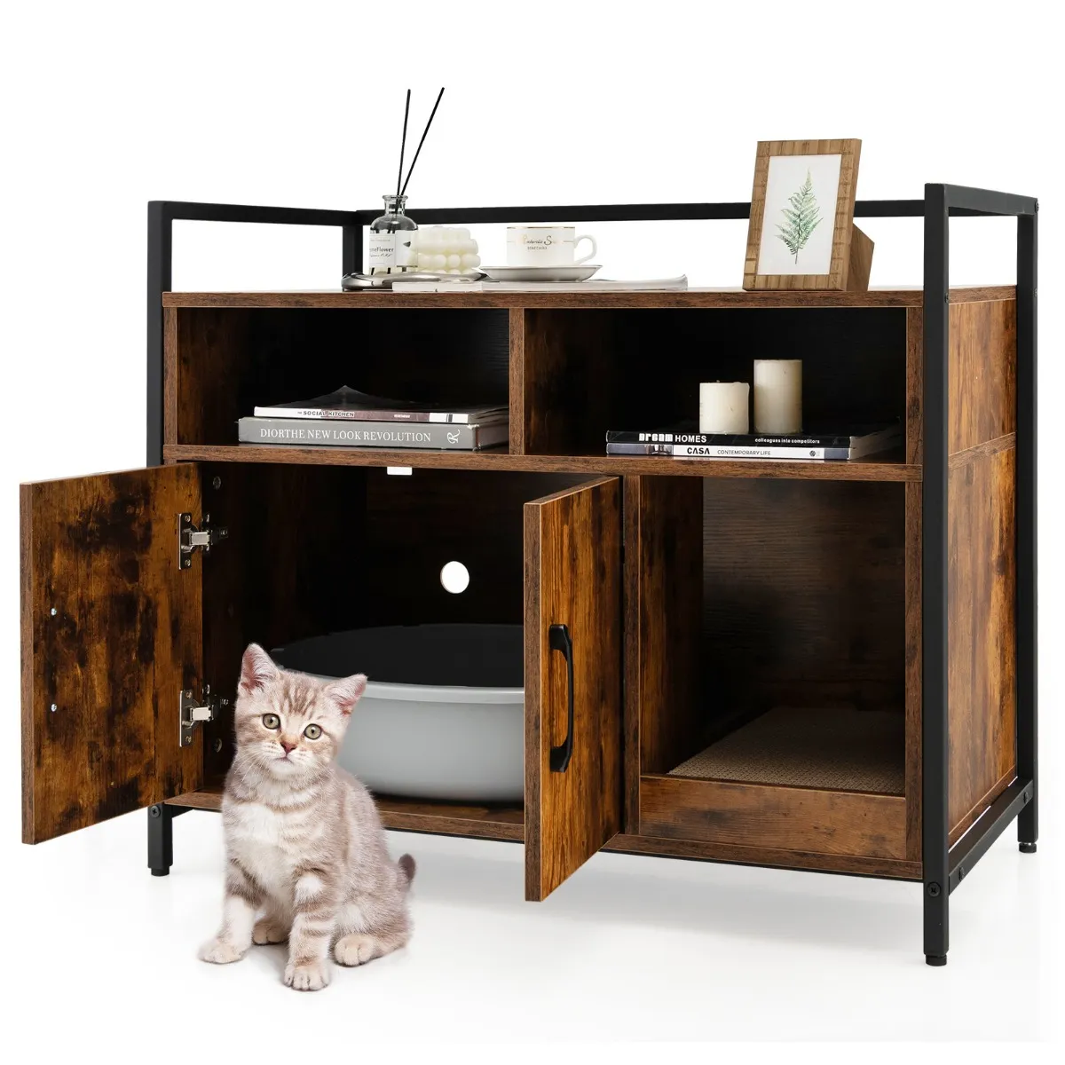 Of u nu een verborgen kattenbak voor decoratie of een opbergkast nodig heeft, onze kattenbak houder is precies wat u nodig heeft. De kast heeft ventilatiegaten en dubbele deuren die zorgen voor ventilatie en privacy, waardoor het de ideale plek is om de kattenbak te verbergen. Bovendien is er een ingang tussen de kast en de plank die gemakkelijk toegang biedt tot het krabpaal compartiment. De dikke mat is bestand tegen de scherpe klauwen van uw kat en beschermt zo uw meubels. De ruime plank en de 2 compartimenten bieden daarentegen voldoende ruimte om al uw dagelijkse benodigdheden op te bergen. Om deze reden is onze kattenbak een perfect meubel bij de ingang en als bijzettafel. Tot slot, dankzij het versterkte metalen frame, de verstelbare poten en de anti-tip voorziening is onze kattenbak in staat om veiligheid en stabiliteit te garanderen, dus haast u en koop hem!