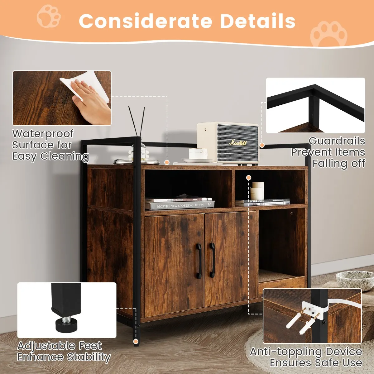 Privé en geventileerde kast: Met een binnenruimte van 52,5 x 43 x 37 cm is de dubbeldeurs kast van onze kattenbak de ideale plek om de kattenbak te verbergen en ze privacy te geven. Het beschikt over een interne ingang voor gemakkelijke toegang tot de volgende plank. Er zijn 3 grote gaten op het achterpaneel om de luchtcirculatie te vergemakkelijken en slechte geuren te verdrijven.