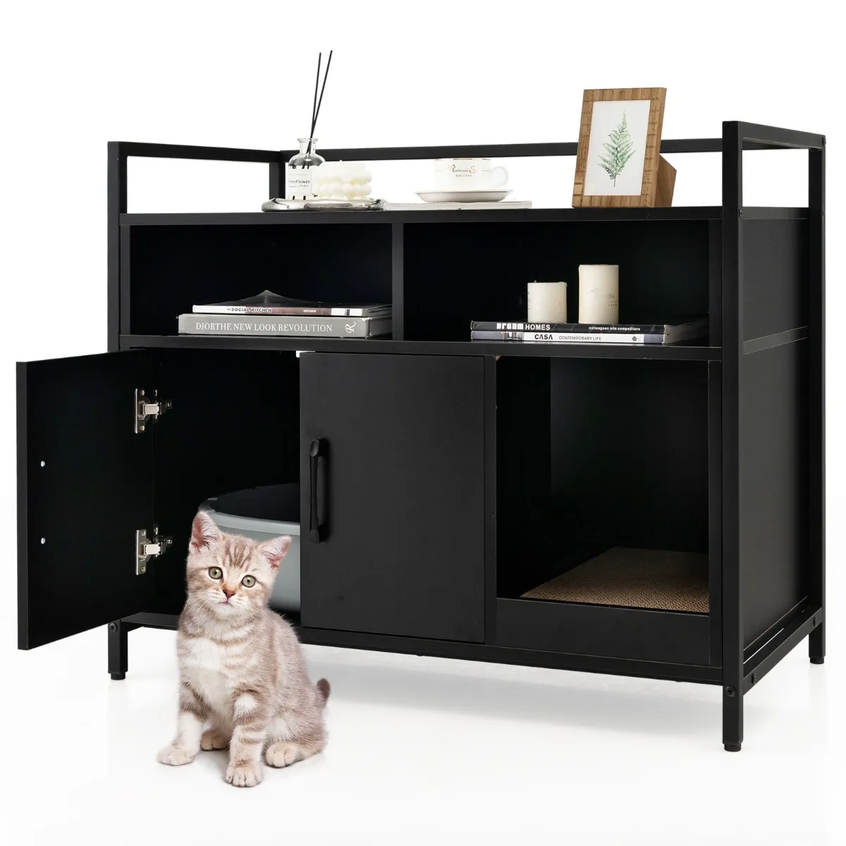Of u nu een verborgen kattenbak voor decoratie of een opbergkast nodig heeft, onze kattenbak houder is precies wat u nodig heeft. De kast heeft ventilatiegaten en dubbele deuren die zorgen voor ventilatie en privacy, waardoor het de ideale plek is om de kattenbak te verbergen. Bovendien is er een ingang tussen de kast en de plank die gemakkelijk toegang biedt tot het krabpaal compartiment. De dikke mat is bestand tegen de scherpe klauwen van uw kat en beschermt zo uw meubels. De ruime plank en de 2 compartimenten bieden daarentegen voldoende ruimte om al uw dagelijkse benodigdheden op te bergen. Om deze reden is onze kattenbak een perfect meubel bij de ingang en als bijzettafel. Tot slot, dankzij het versterkte metalen frame, de verstelbare poten en de anti-tip voorziening is onze kattenbak in staat om veiligheid en stabiliteit te garanderen, dus haast u en koop hem!